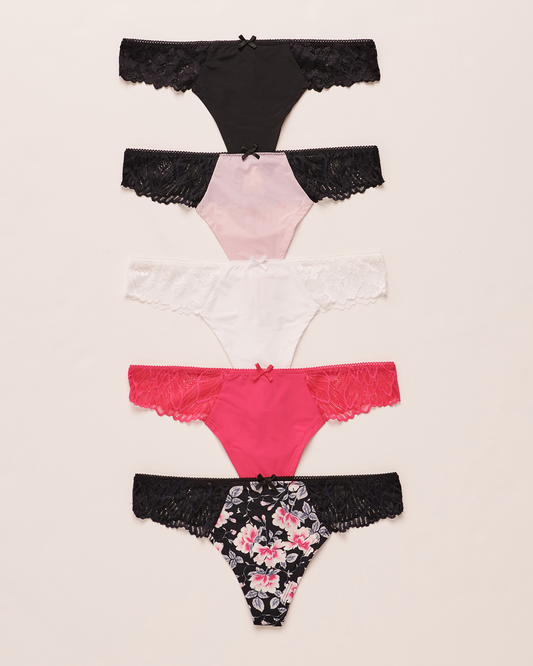 The colors and prints of the pack are: black, white, bright pink, floral print, light pink