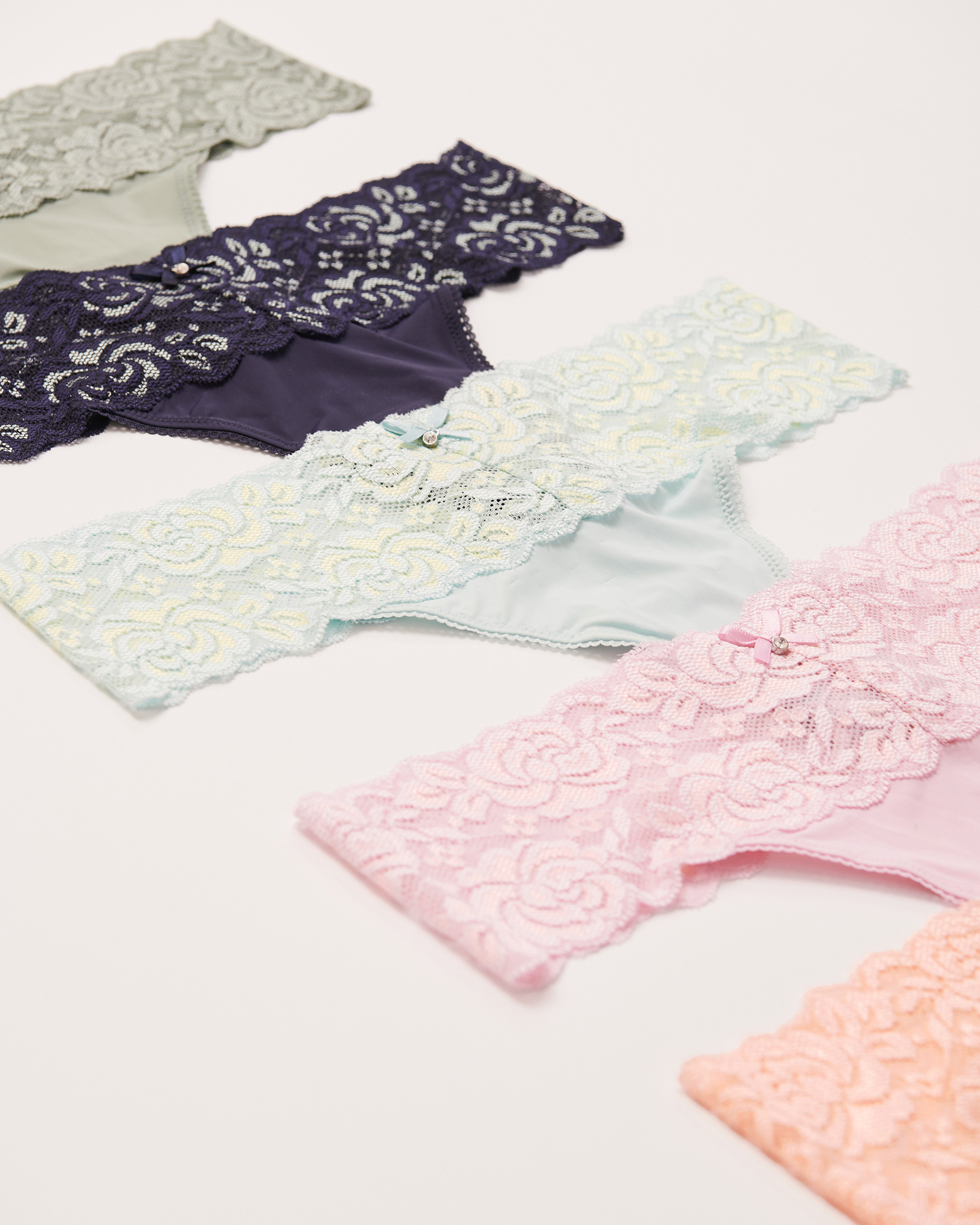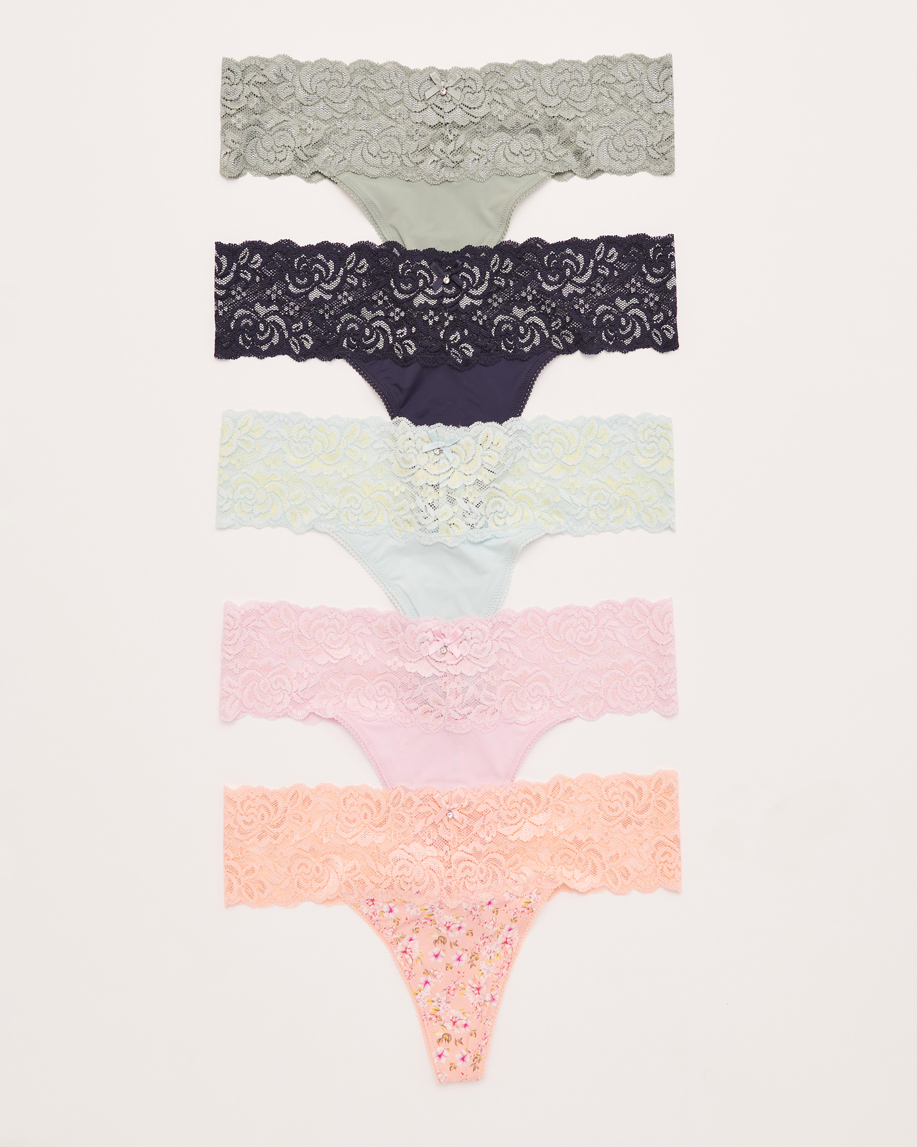 5-Pack Microfiber and Wide Lace Band Thong Panty
