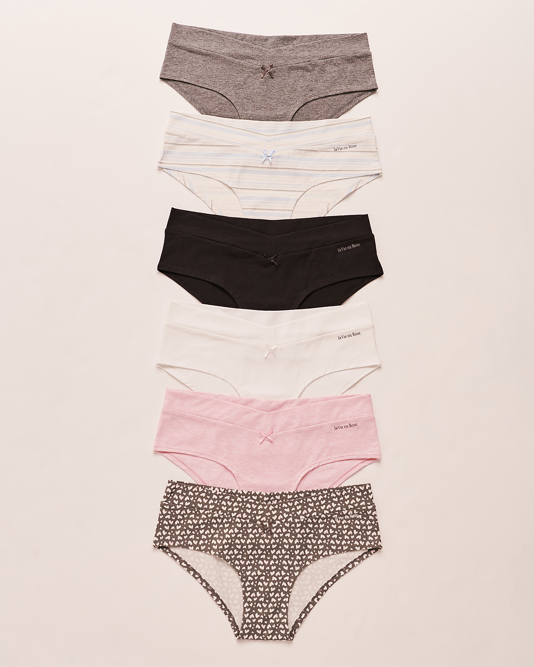 The colors and prints of the pack are: black, grey, white, pink, stripe print, heart print