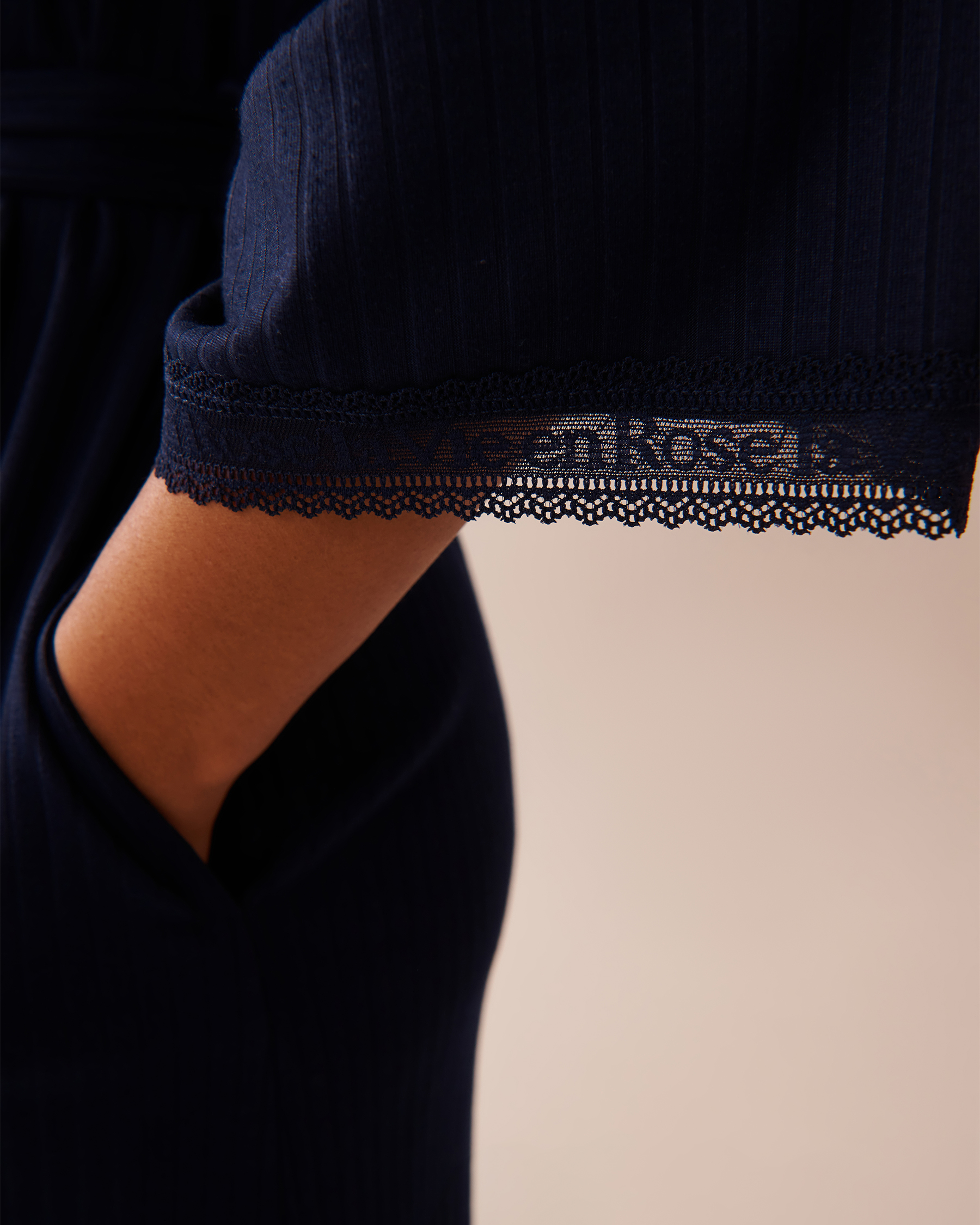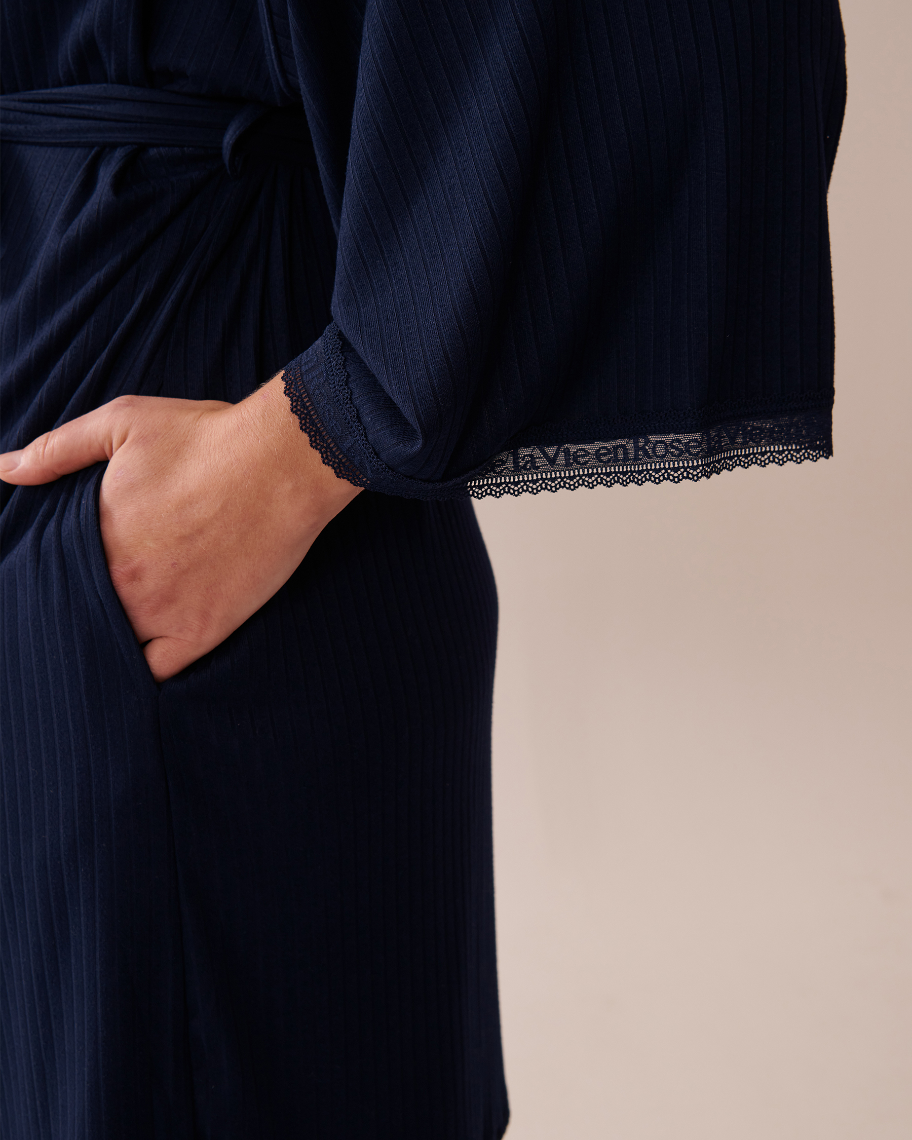 A classic kimono, elevated with a soft ribbed fabric and delicate lace trim.