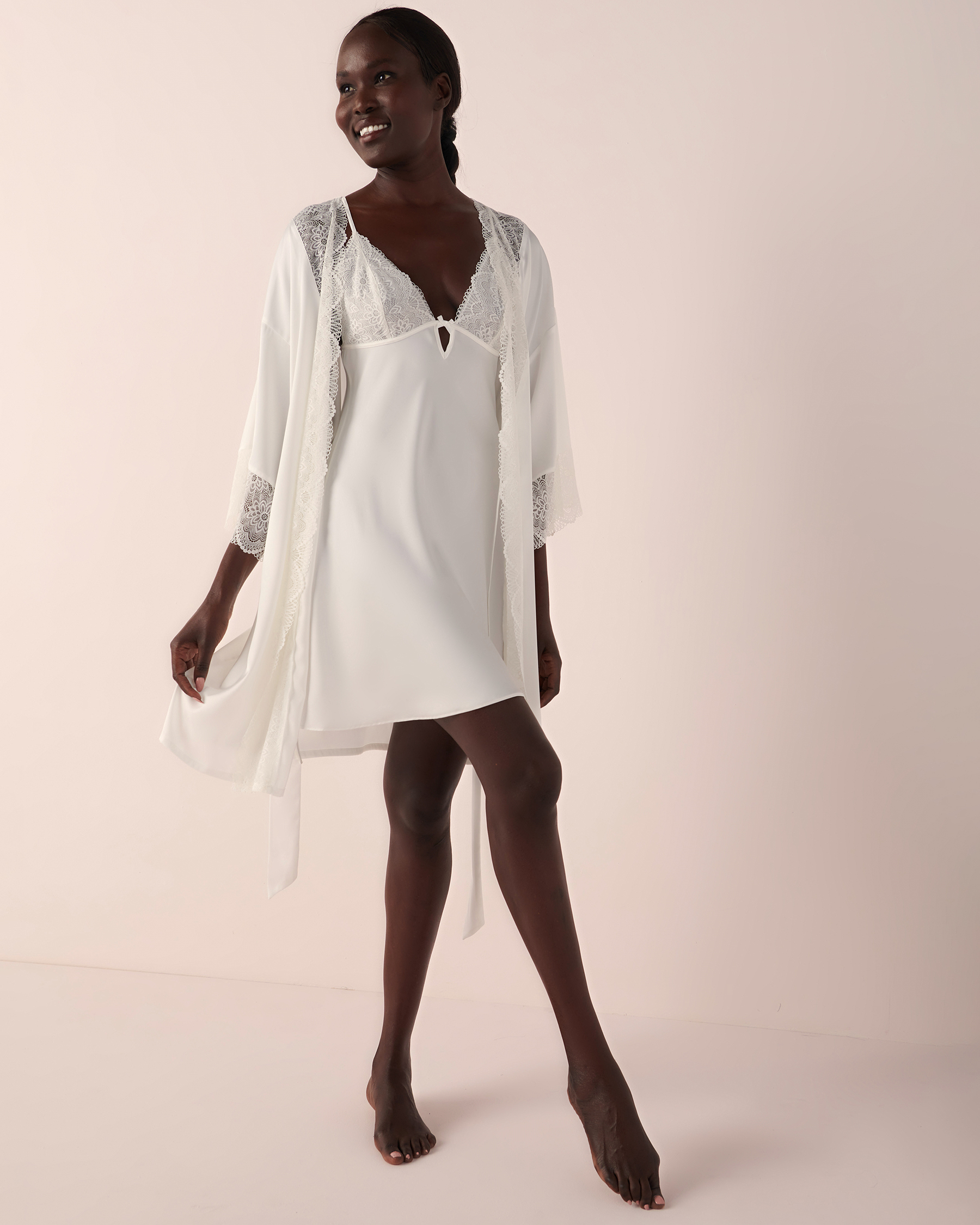 With its delicate colours and finely crafted lace, this satin kimono will make you feel even more beautiful. This chic and stylish kimono is perfect for your moments of relaxation. Wear it with our matching nighties for a trendy head-to-toe look.