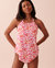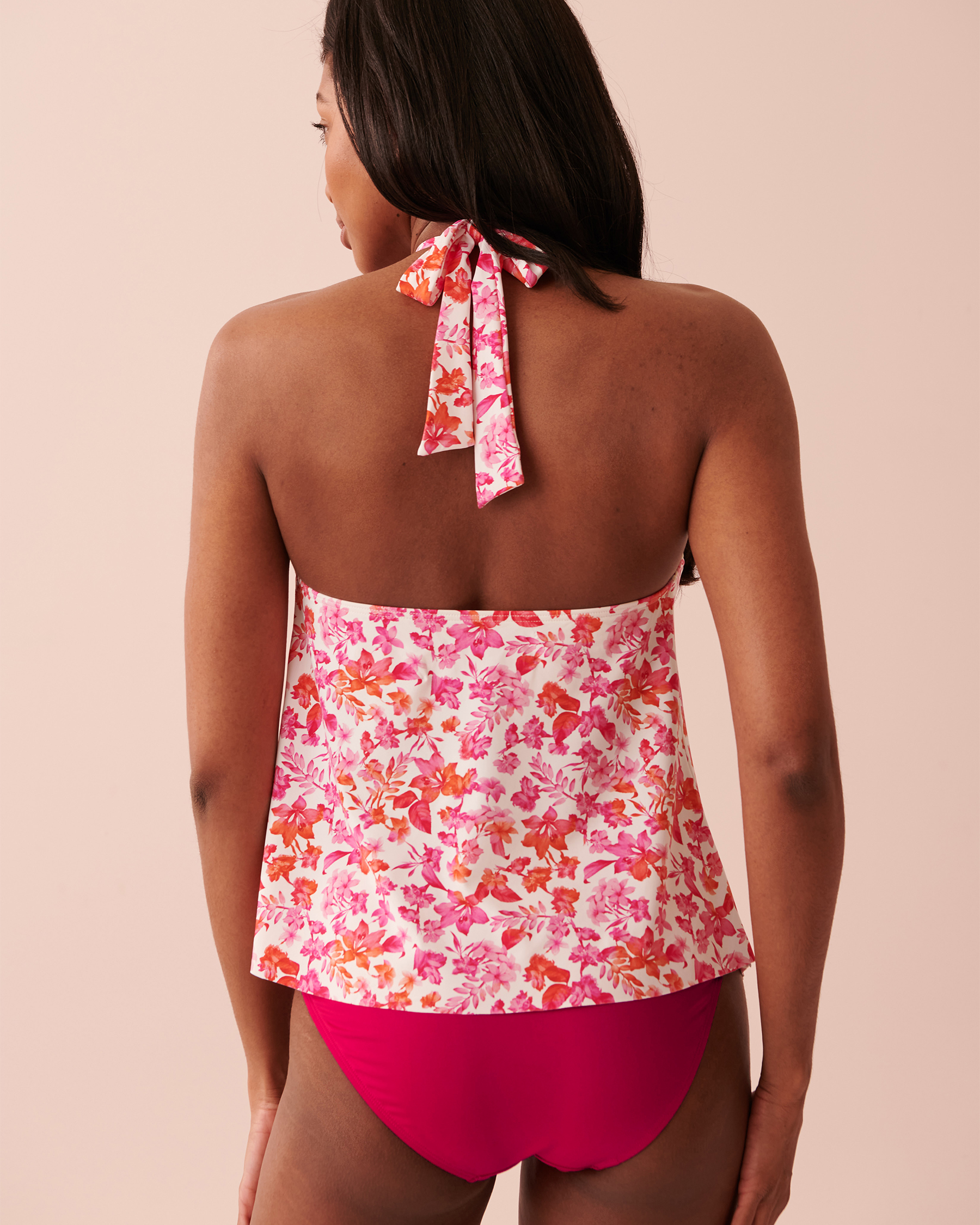 Make a splash in our cute, colorful floral print swimwear! This vibrant tankini top offers a breezy feel that makes it super comfy. Its pointed hemline and halter straps embellished with a pretty knot also add a stylish touch. With removable pads, it allows a more or less curved bust.