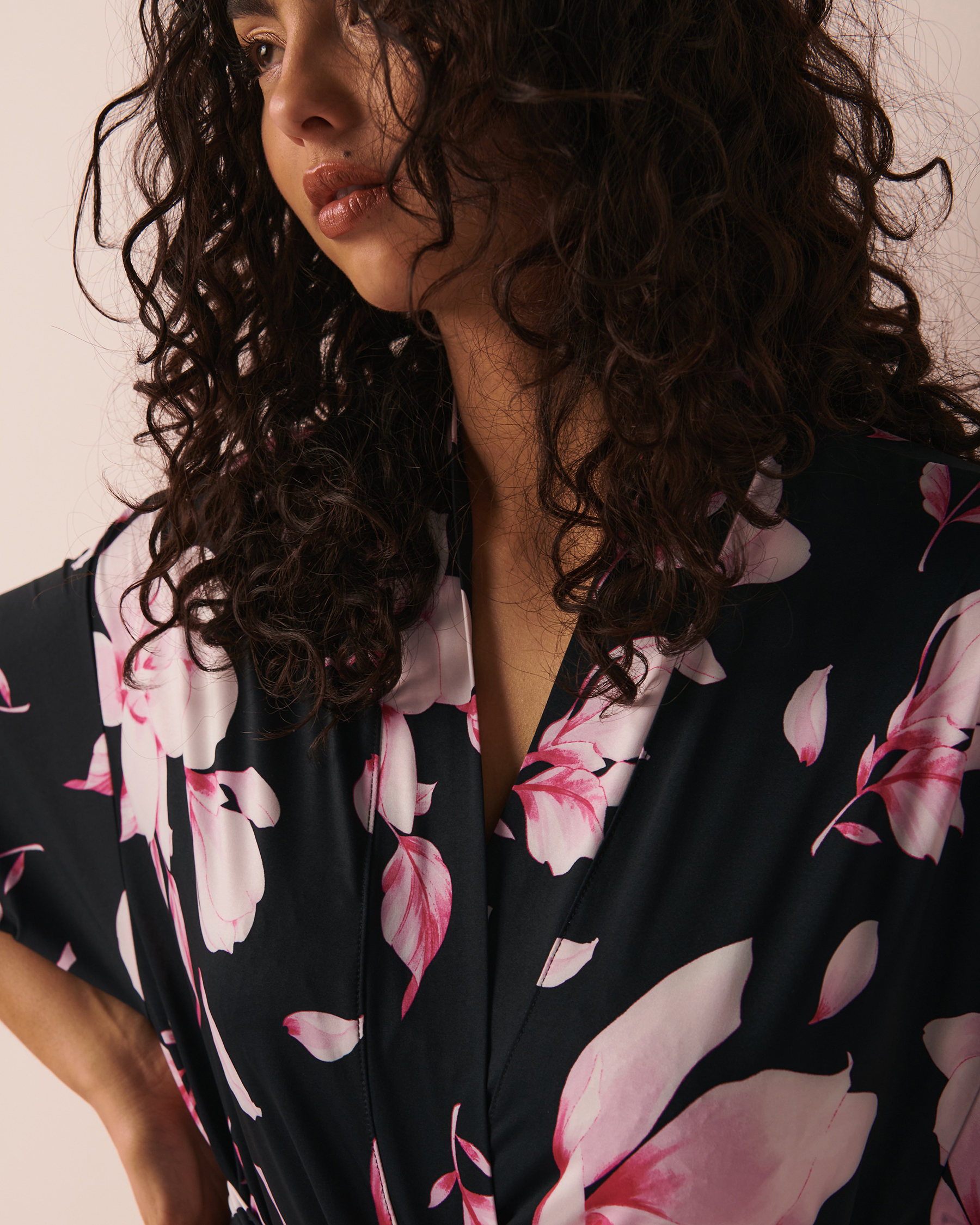 Romantic magnolias! Maxi-length kimono with side pockets and allover floral print.