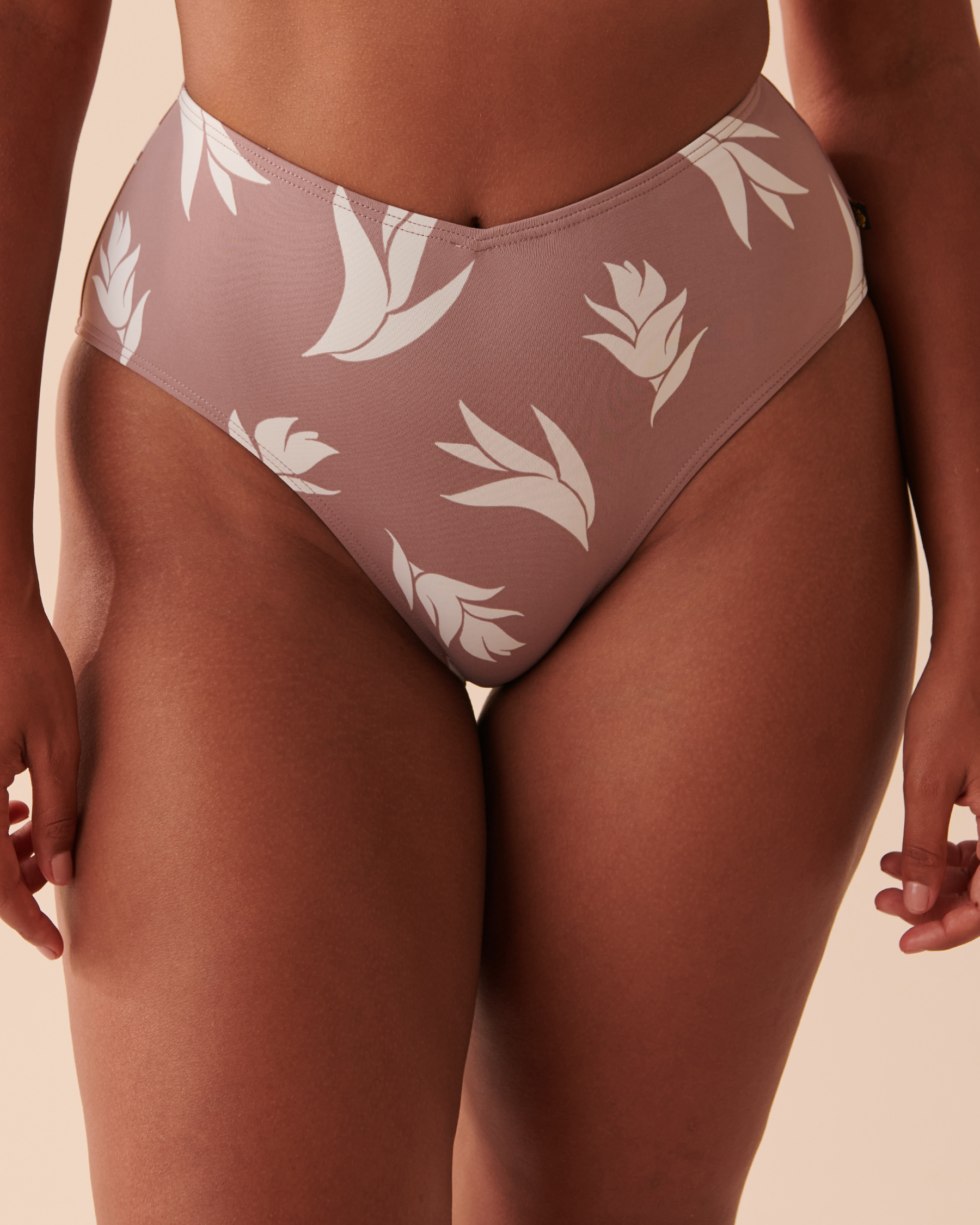 This high-waist cheeky bikini bottom features a minimalist tropical pattern and an elegant V-cut at the front and back, perfectly accentuating your curves with sophisticated retro allure.