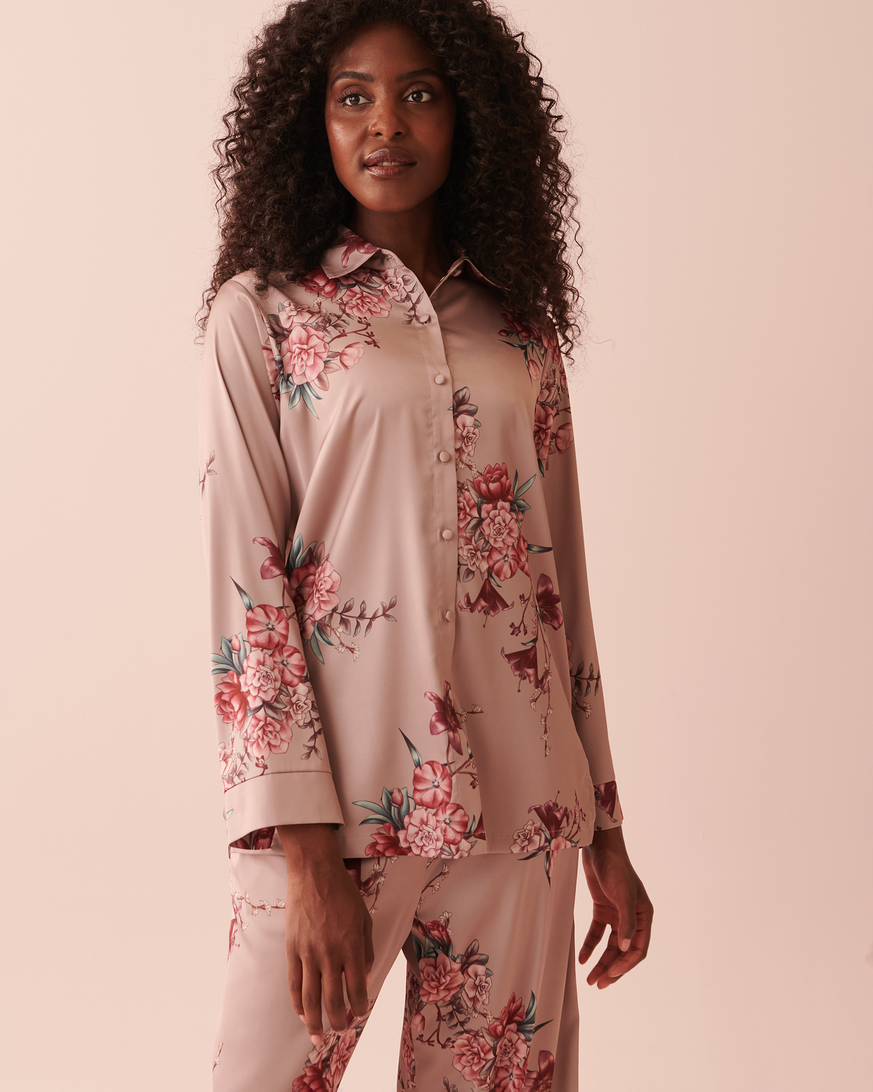 Elevate your loungewear with this luxurious satin shirt! Crafted from silky smooth satin fabric, it provides a sumptuous feel against your skin. Delight in the poetic beauty of radiant autumn blossoms!