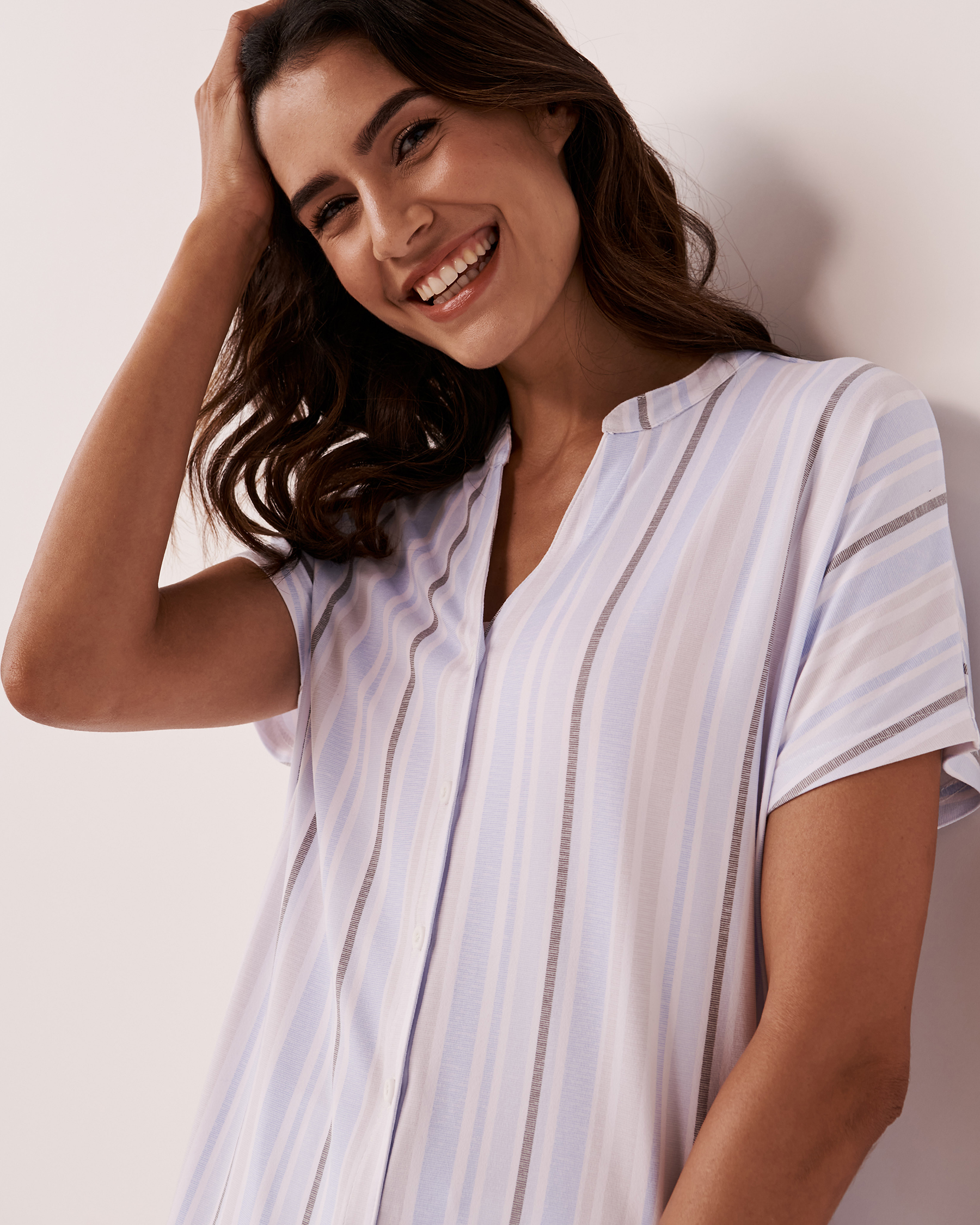 Super soft button-down short sleeve shirt with adjustable drawstring.
