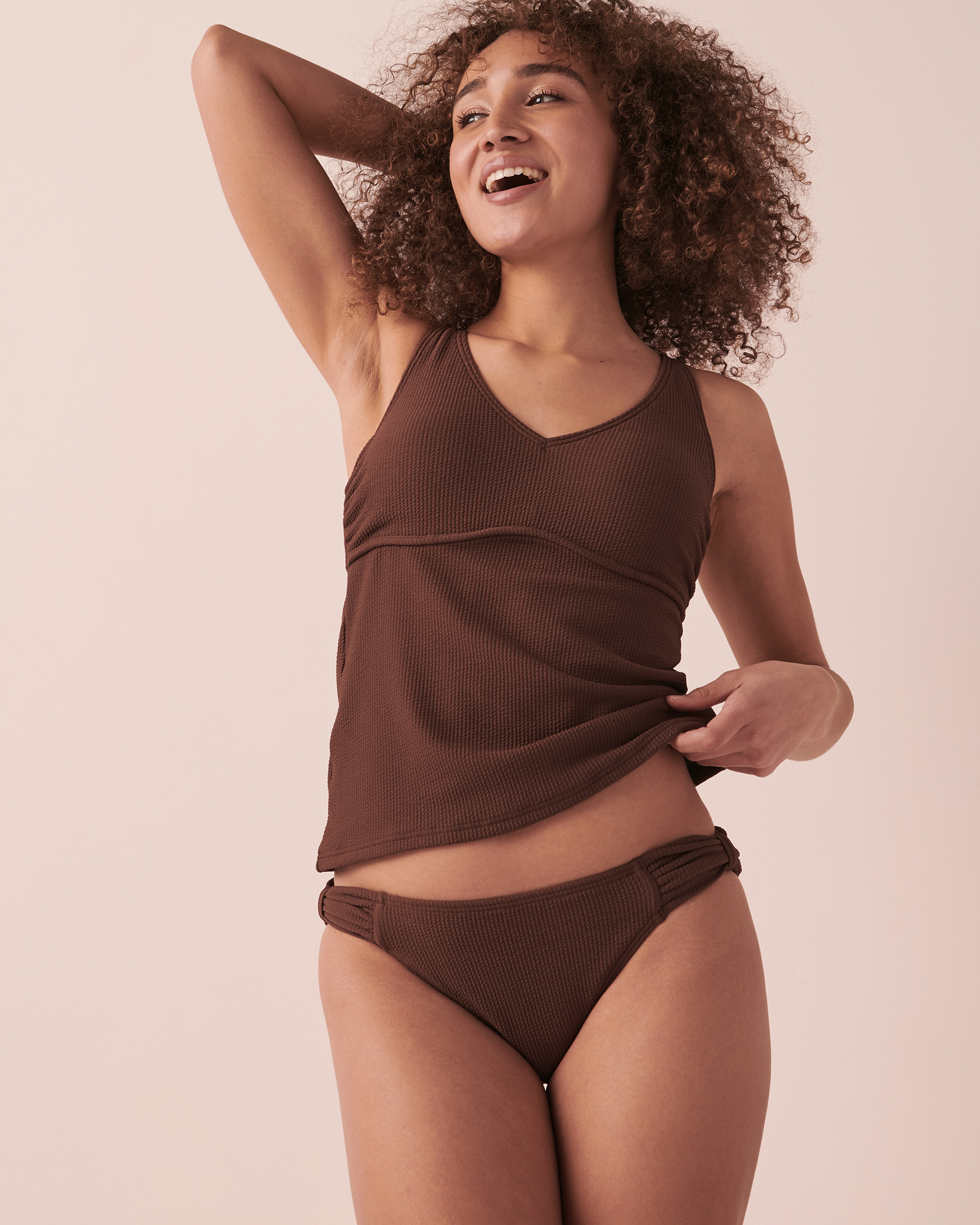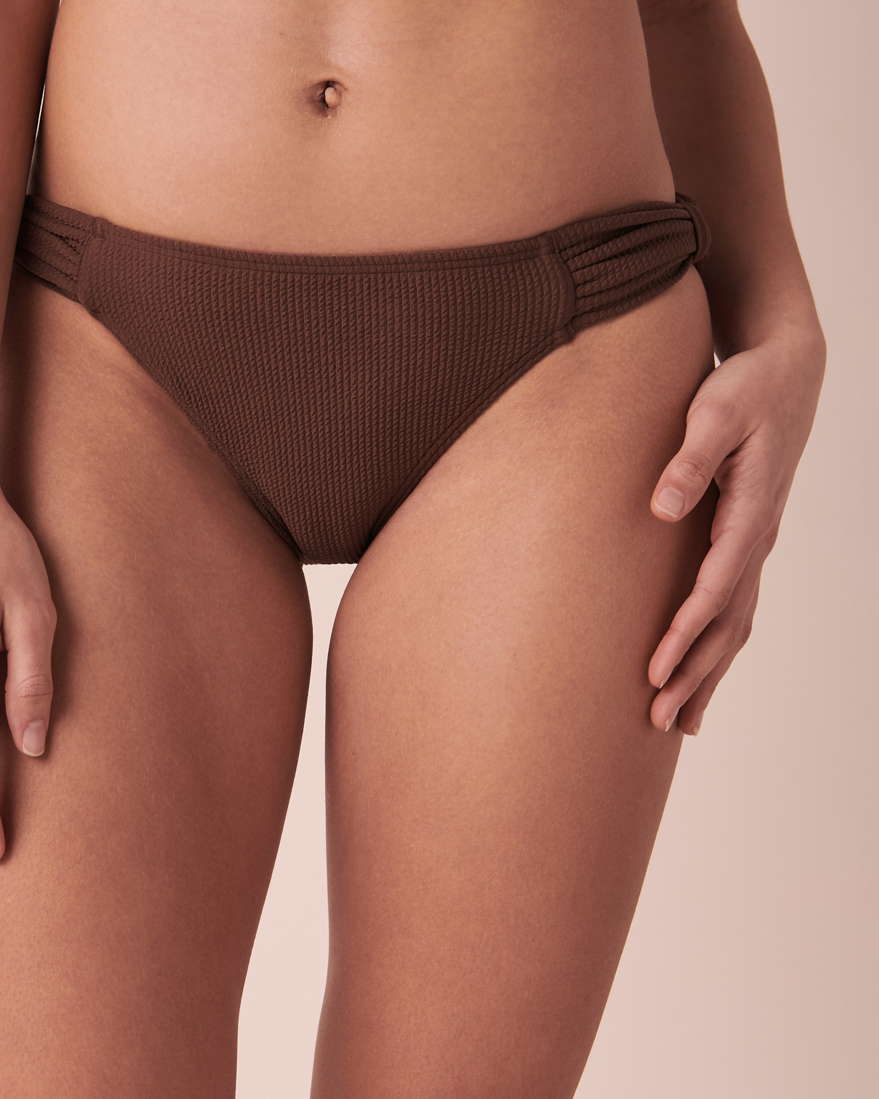 Your future favorite suit is all about texture! This new textured fabric bikini bottom is all you could wish for. It has a cozy feel, chic and never out of style colors AND knotted sides for a natural stylish look! It will be your bestie for all your sunny getaways.