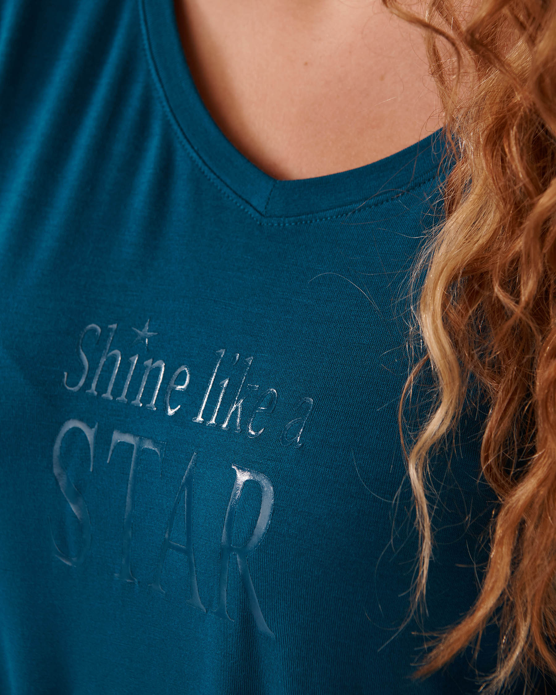 Douceur, confort et simplicité se rencontrent dans ce t-shirt de pyjama aux jolies nuances de bleus apaisants. Portez-le avec nos bas de pyjama assortis et créez un moment de détente qui vous ressemble.