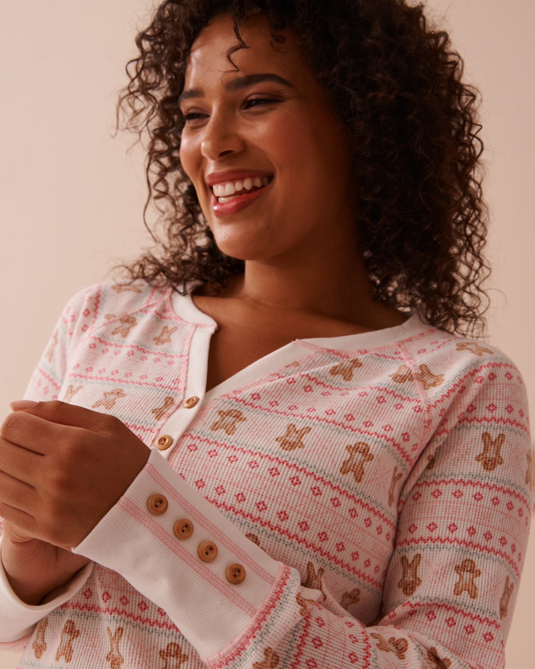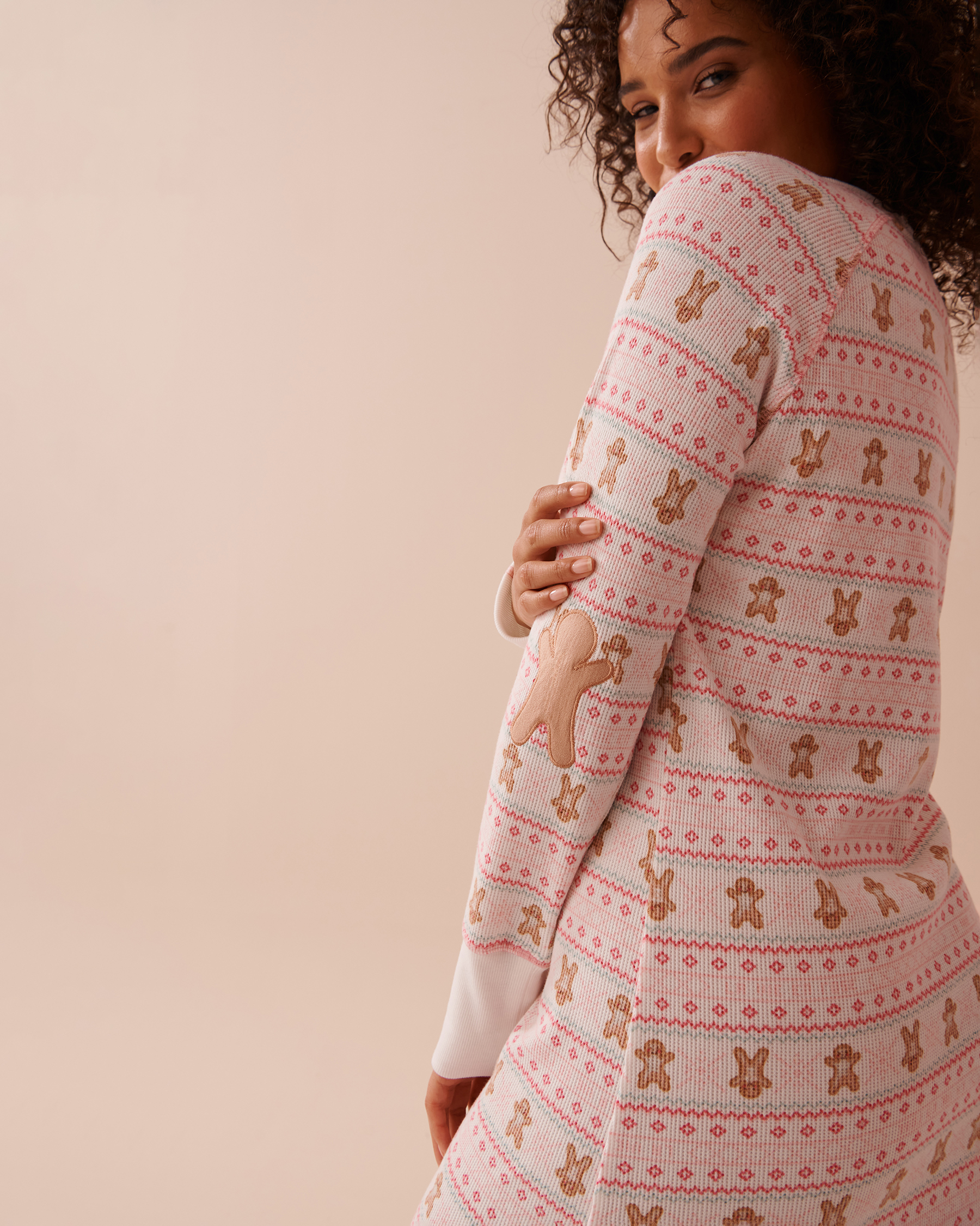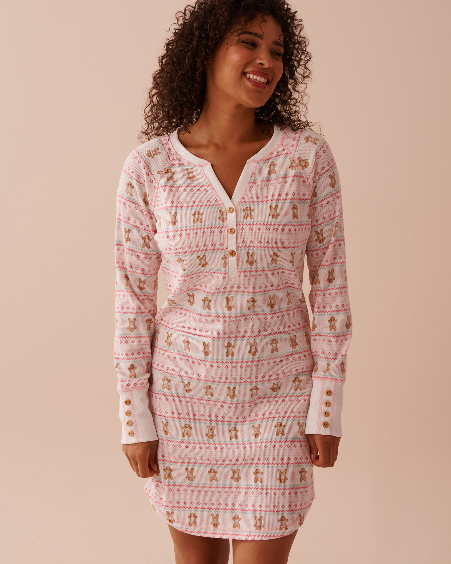 Chemise de nuit manches longues en tricot gaufré imprimé pain d'épices