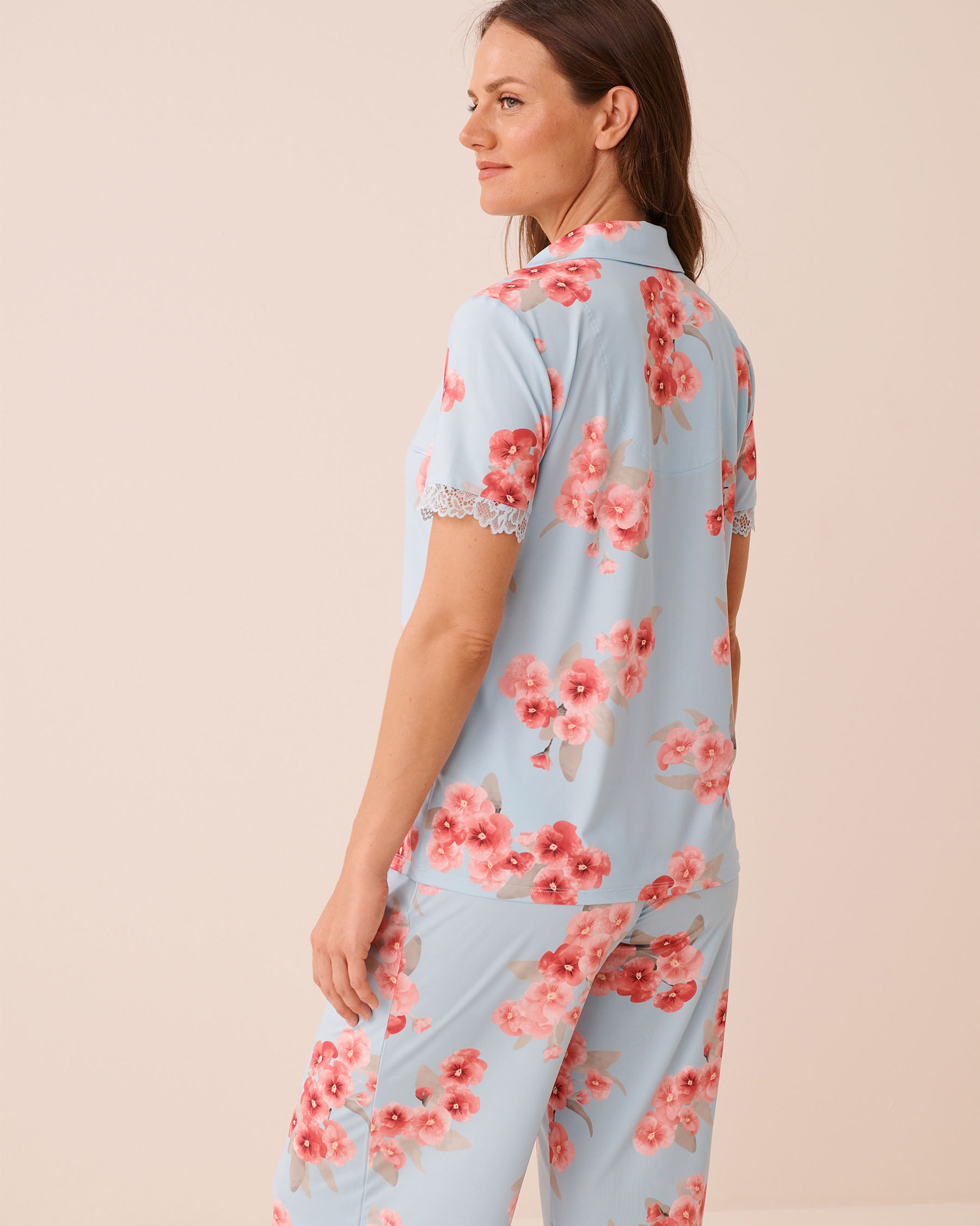 La microfibre pour la légèreté. La dentelle pour le détail. Et un imprimé floral qui appelle le printemps. Ce chemisier de pyjama invite à déconnecter, en douceur.