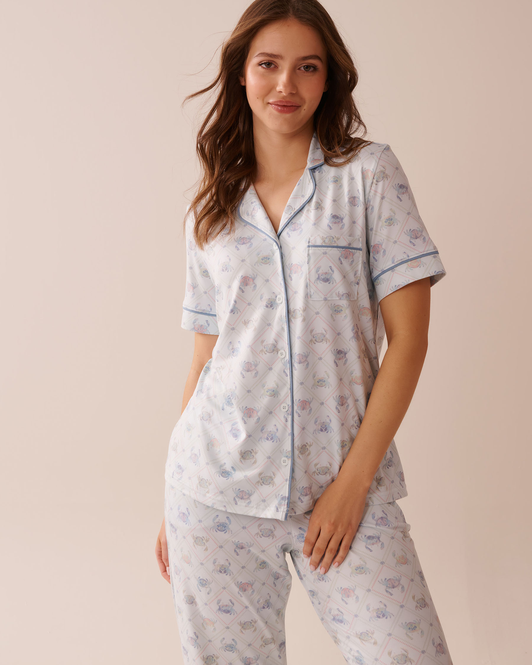 Des teintes pastel qui nous évoquent un lever de soleil en bord de mer, de petits motifs marins révisités avec un brin de fantaisie... Nos pyjamas en tissu peau de pêche - adorés pour leur douceur parfaite - se renouvellent pour la saison. Ce chemisier trouve un équilibre parfait entre charme décontracté et style sophistiqué.