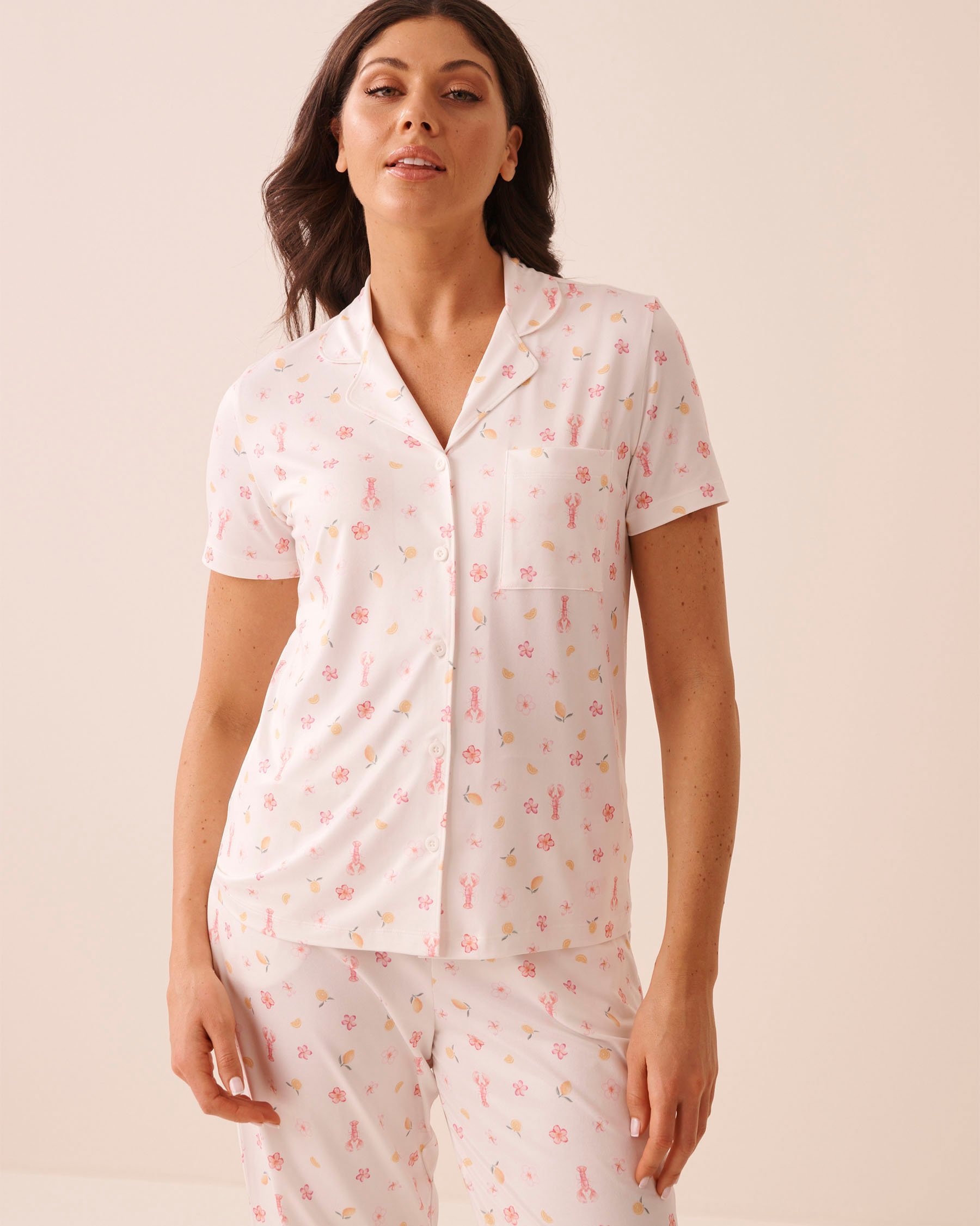 On en pince totalement pour cet imprimé! Fantaisie, délicatement fleuri et fruité, il s'accorde parfaitement avec notre tissu peau de pêche qu'on adore pour sa douceur. Un chemisier à porter avec nos bas assortis pour un pyjama estival super confortable.