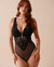 Un mariage parfait de délicatesse et d'audace : notre combiné plongeant en résille et dentelle brodée avec des détails lacés et une coupe brésilienne à l'arrière.