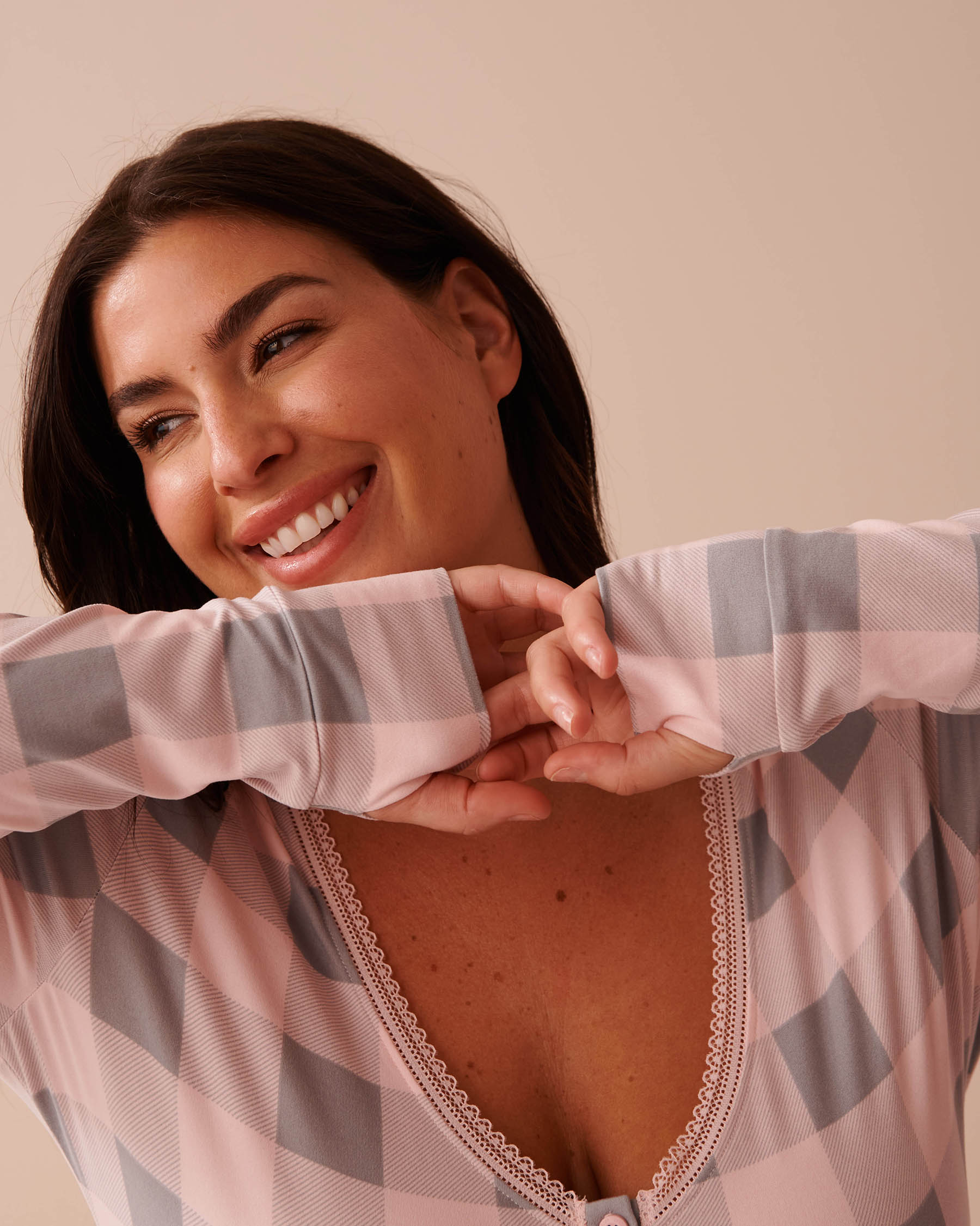 Combishort manches longues ultra doux à carreaux roses