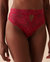 Ornée d'une dentelle délicate, de détails croisés et d'une teinte rouge passionnée, cette culotte tanga taille haute dévoile la peau avec élégance.