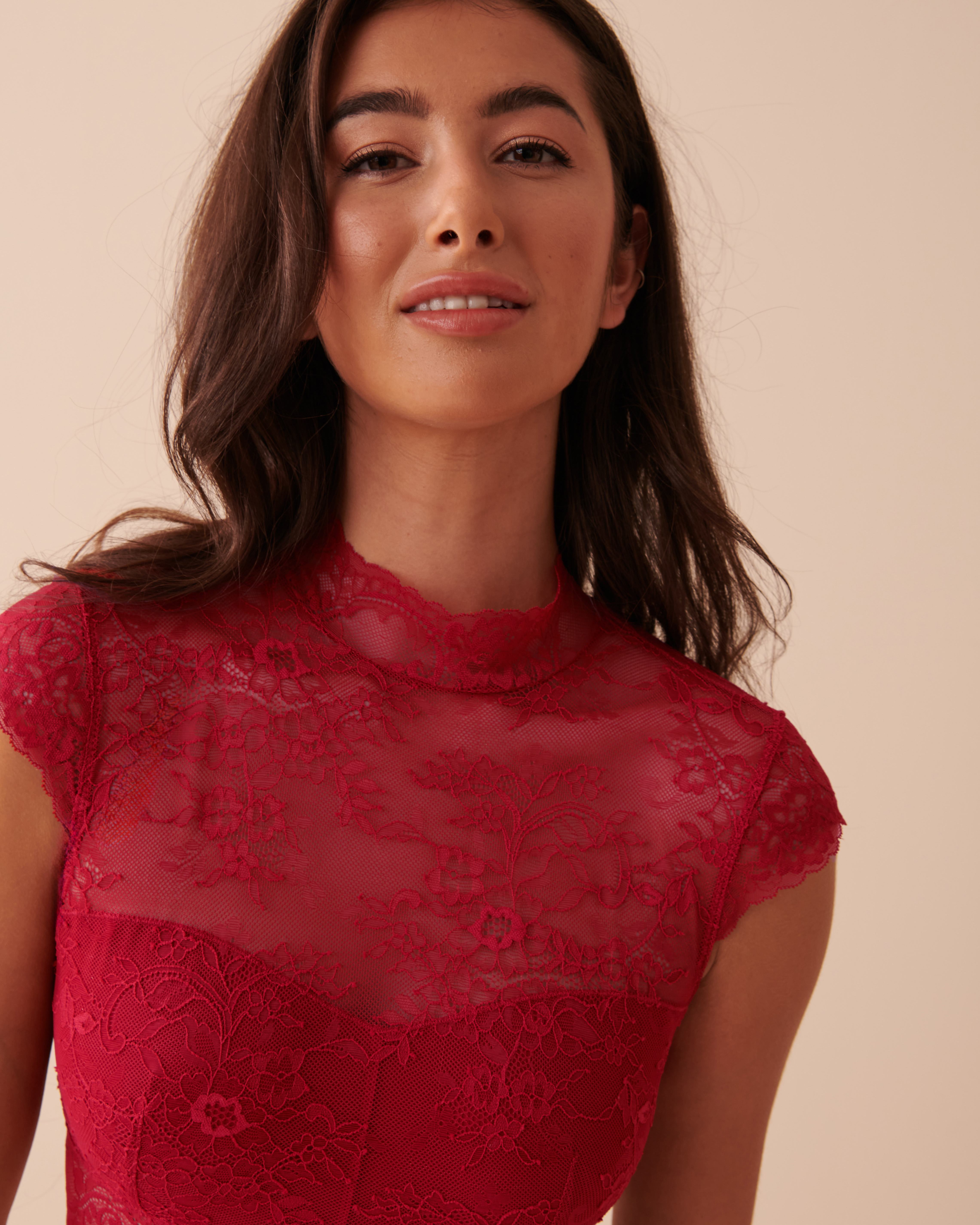Un belle dentelle florale orne délicatement le haut court et le bas jupe de cet ensemble séduisant qui vous fera rayonner de confiance.
