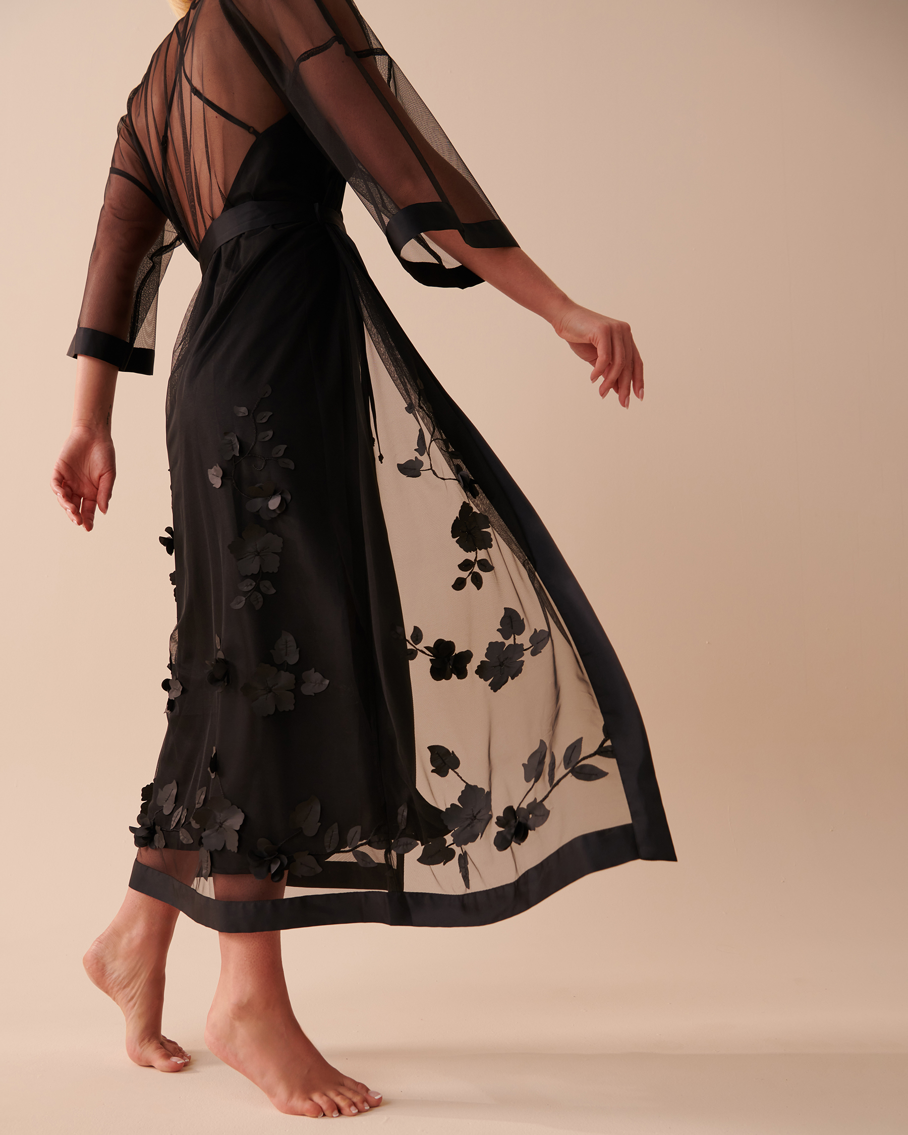 Ajoutez une touche de grâce à votre lingerie avec notre long kimono en résille transparente et laissez votre beauté naturelle resplendir grâce à sa délicate poésie florale.