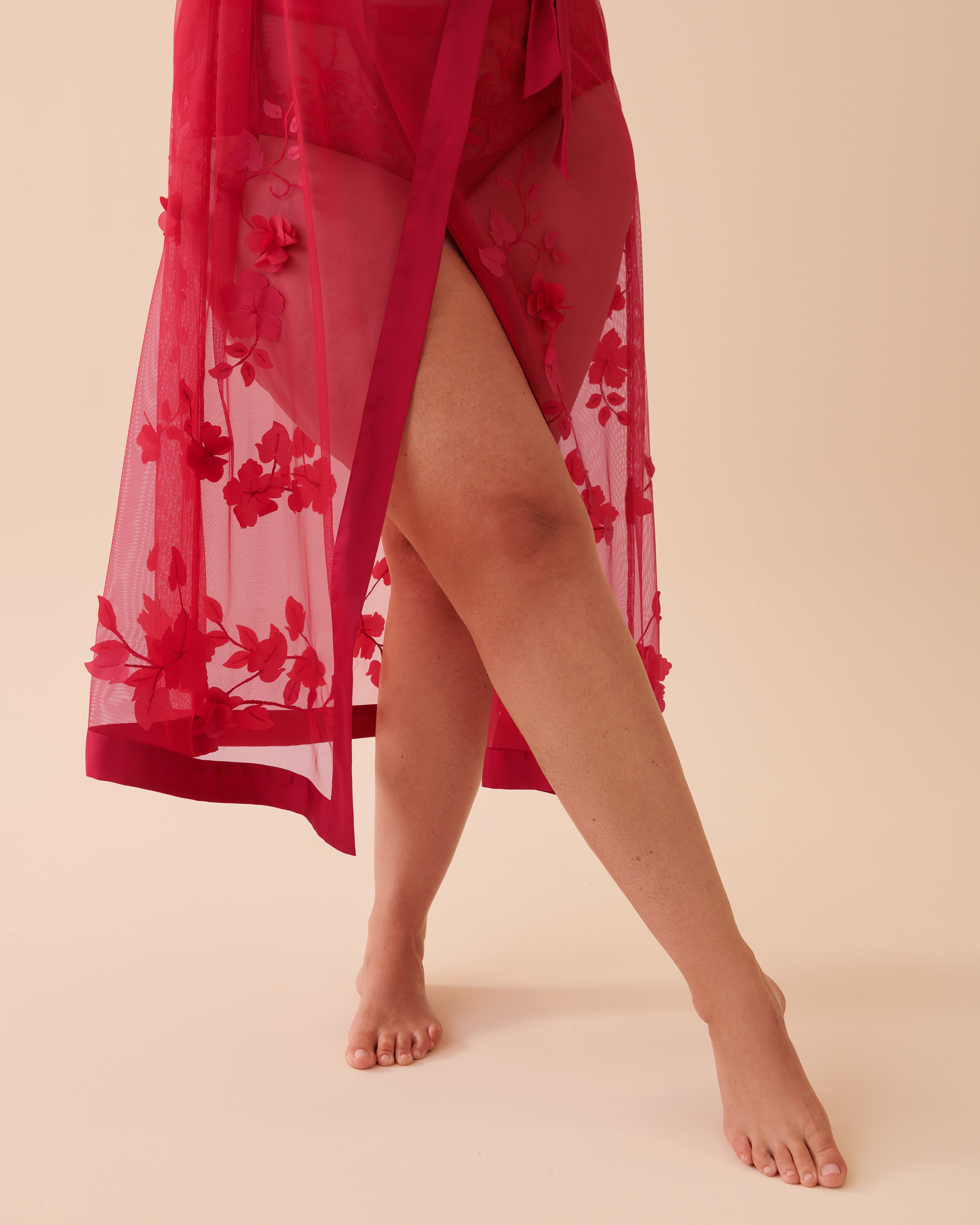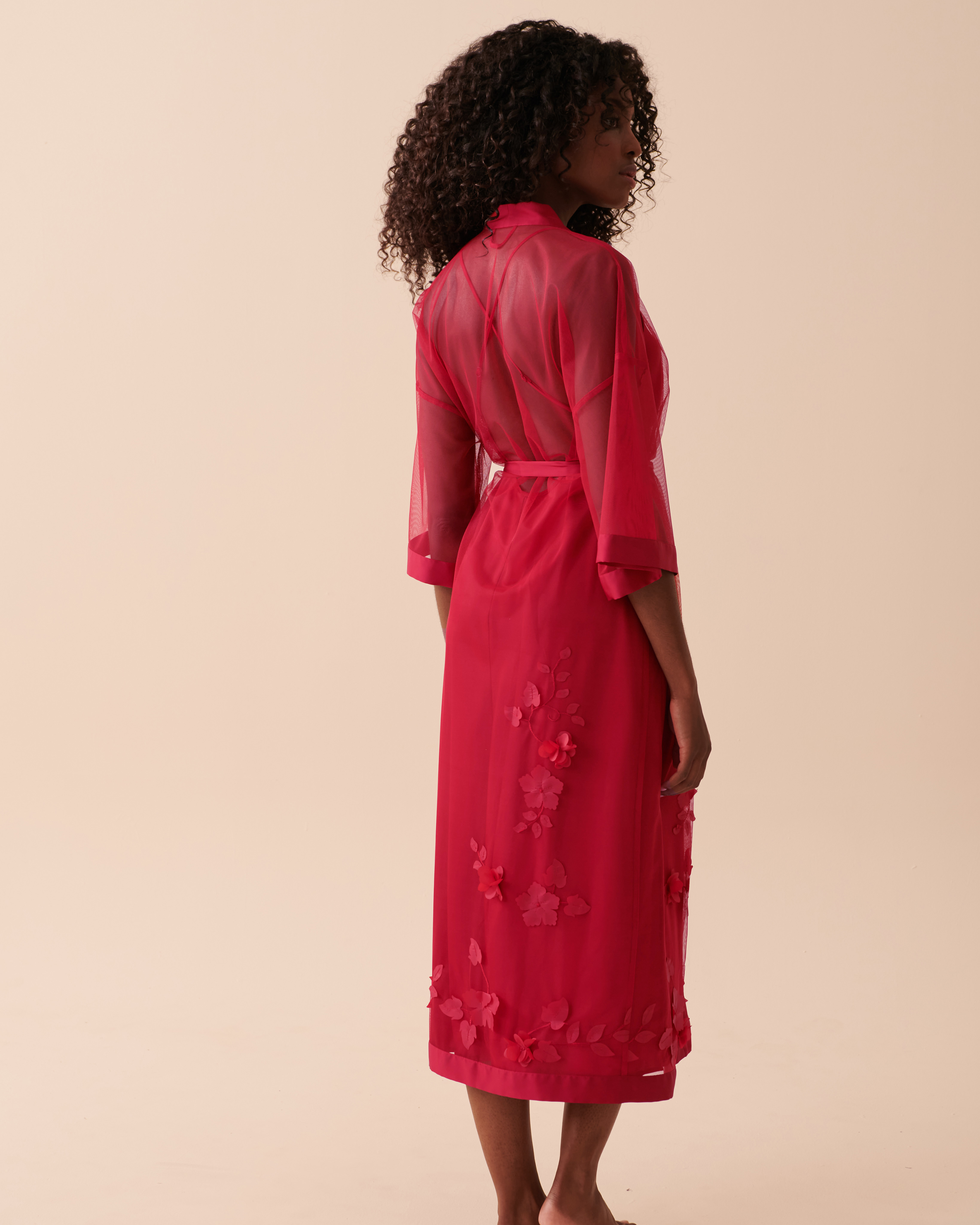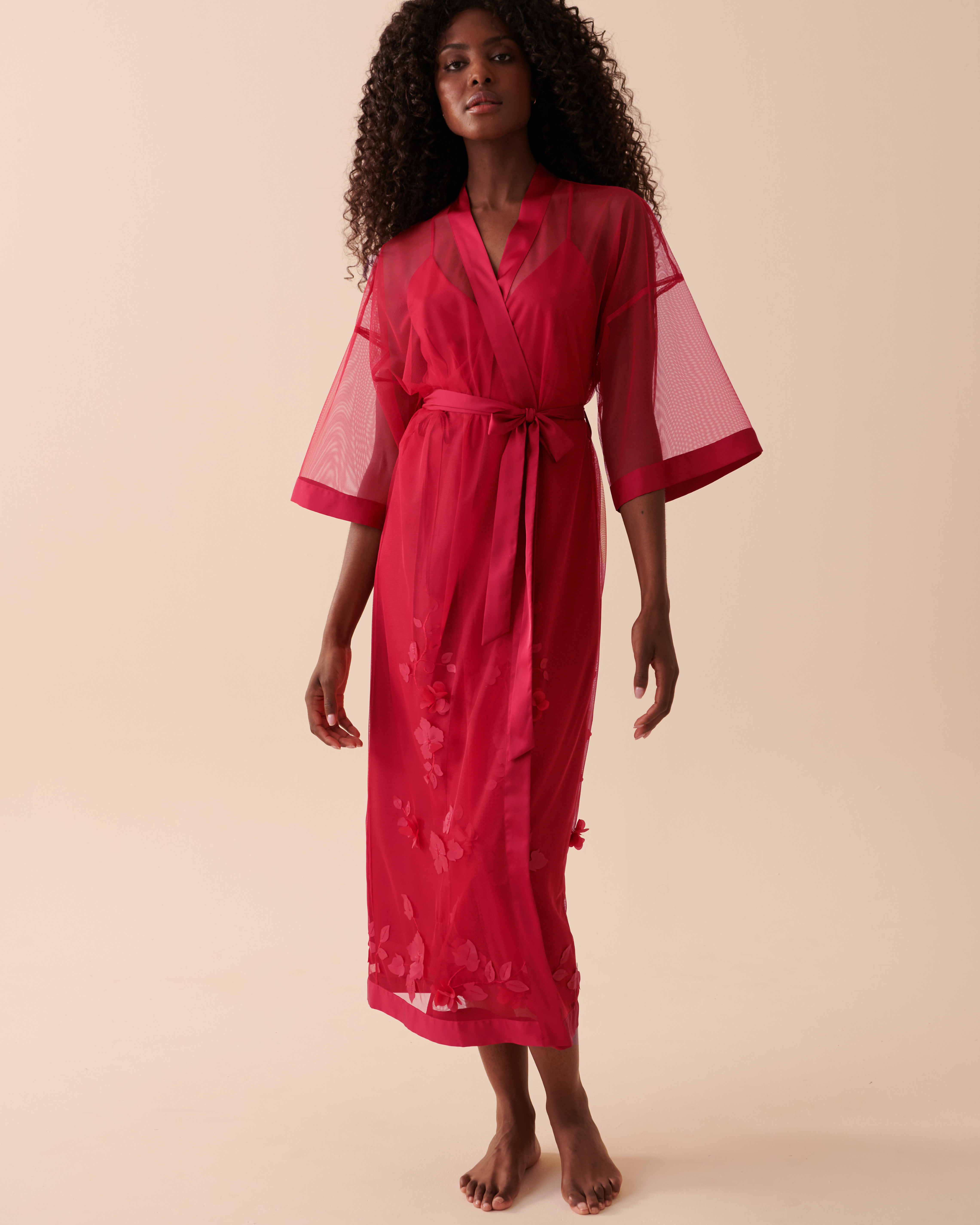 Ajoutez une touche de grâce à votre lingerie avec notre long kimono en résille transparente et laissez votre beauté naturelle resplendir grâce à sa délicate poésie florale.