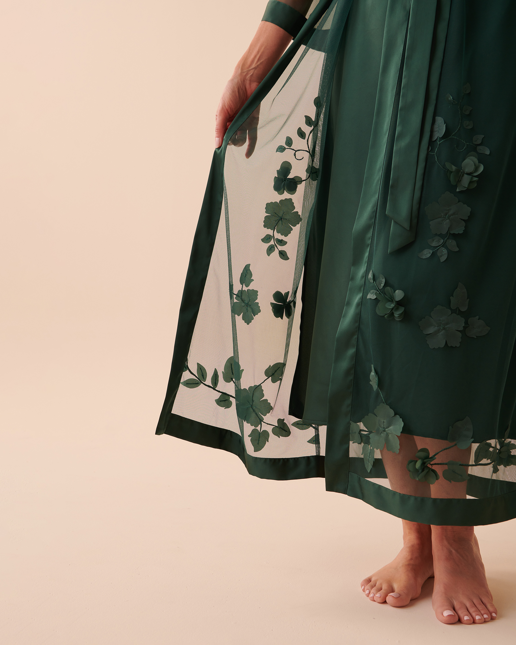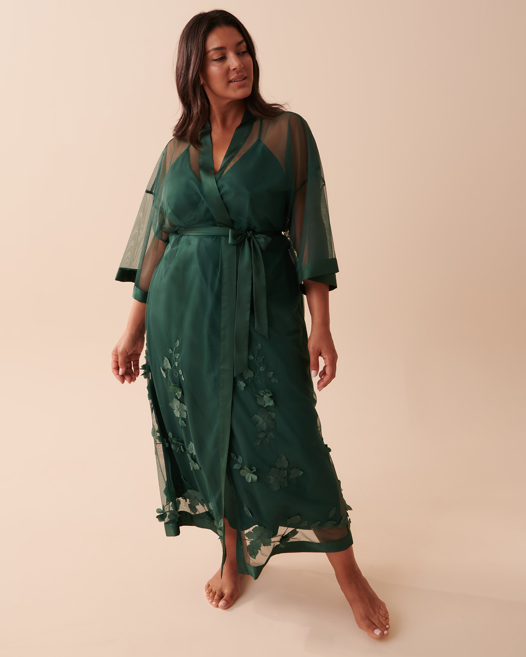 Ajoutez une touche de grâce à votre lingerie avec notre long kimono en résille transparente et laissez votre beauté naturelle resplendir grâce à sa délicate poésie florale.