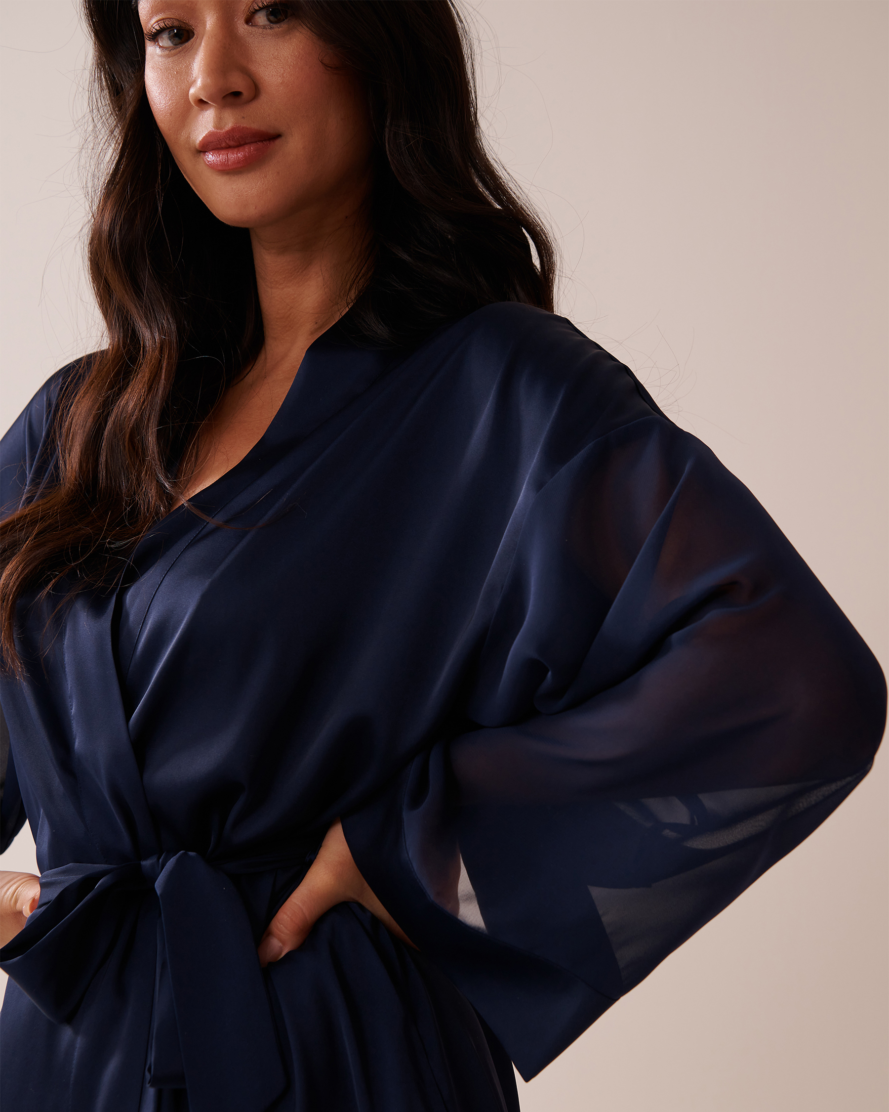 Chaque détail de ce kimono en satin, des insertions transparentes en chiffon à sa coupe légère et vaporeuse, rayonne d'élégance.