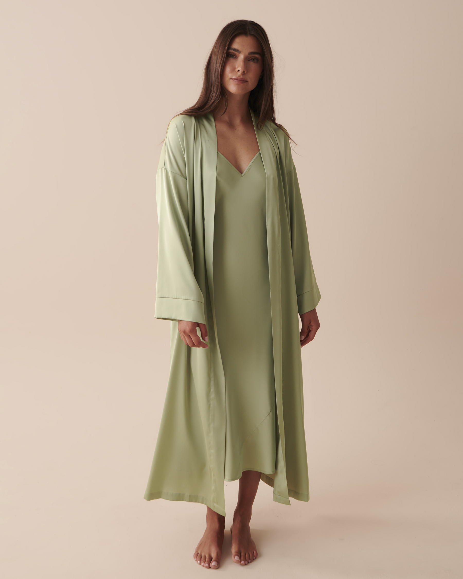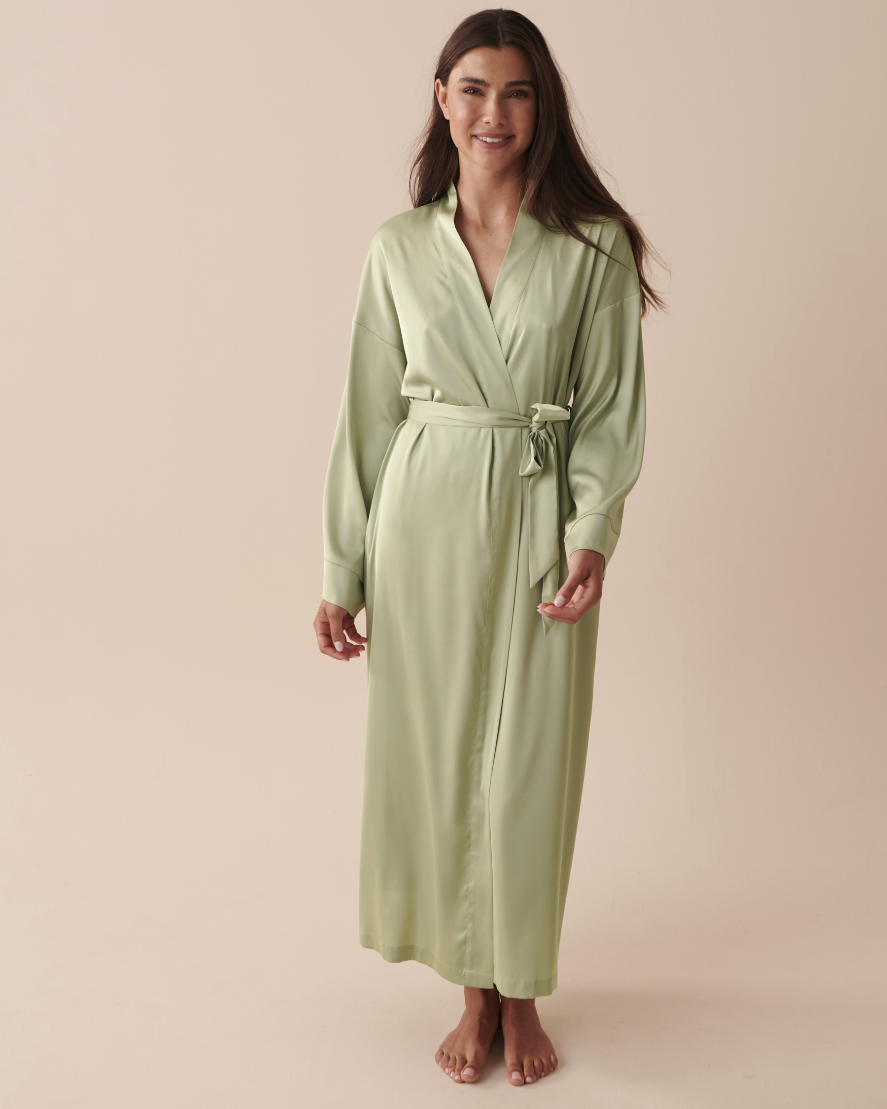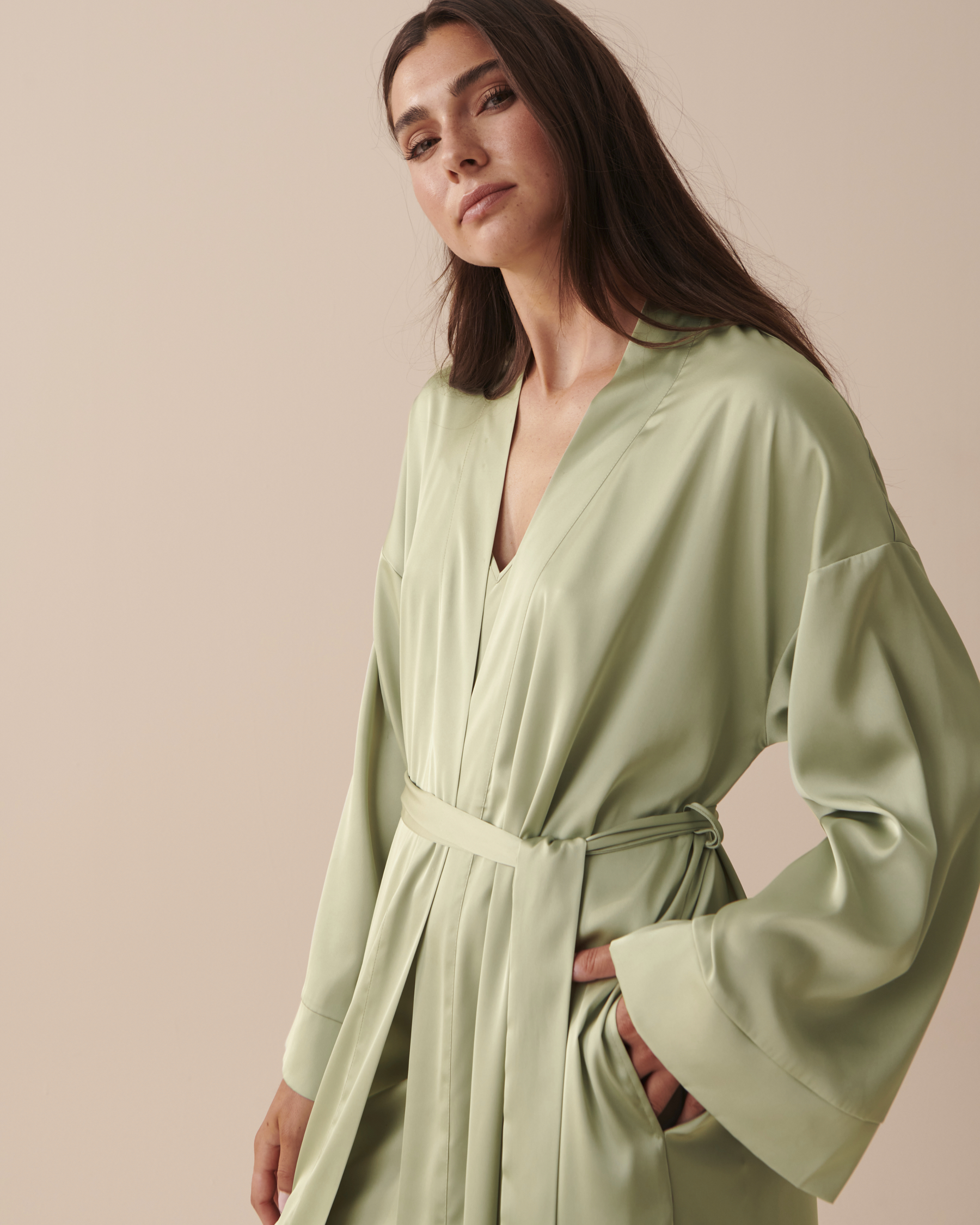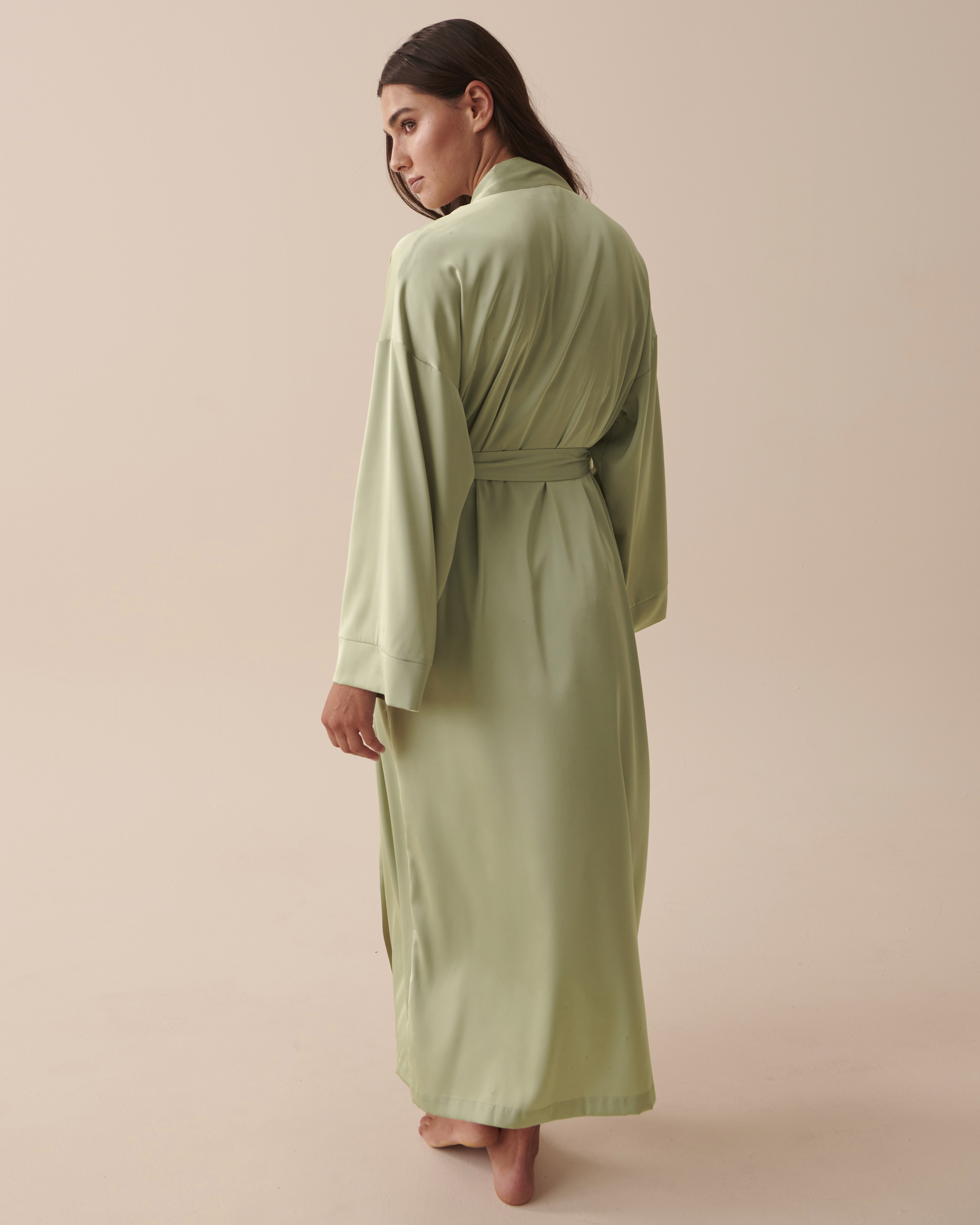 Détendez-vous comme jamais auparavant avec notre kimono soyeux en satin! Choisissez entre un blanc classique et raffiné et une teinte apaisante de vert sauge, et offrez-vous la fusion parfaite de style et de confort.
