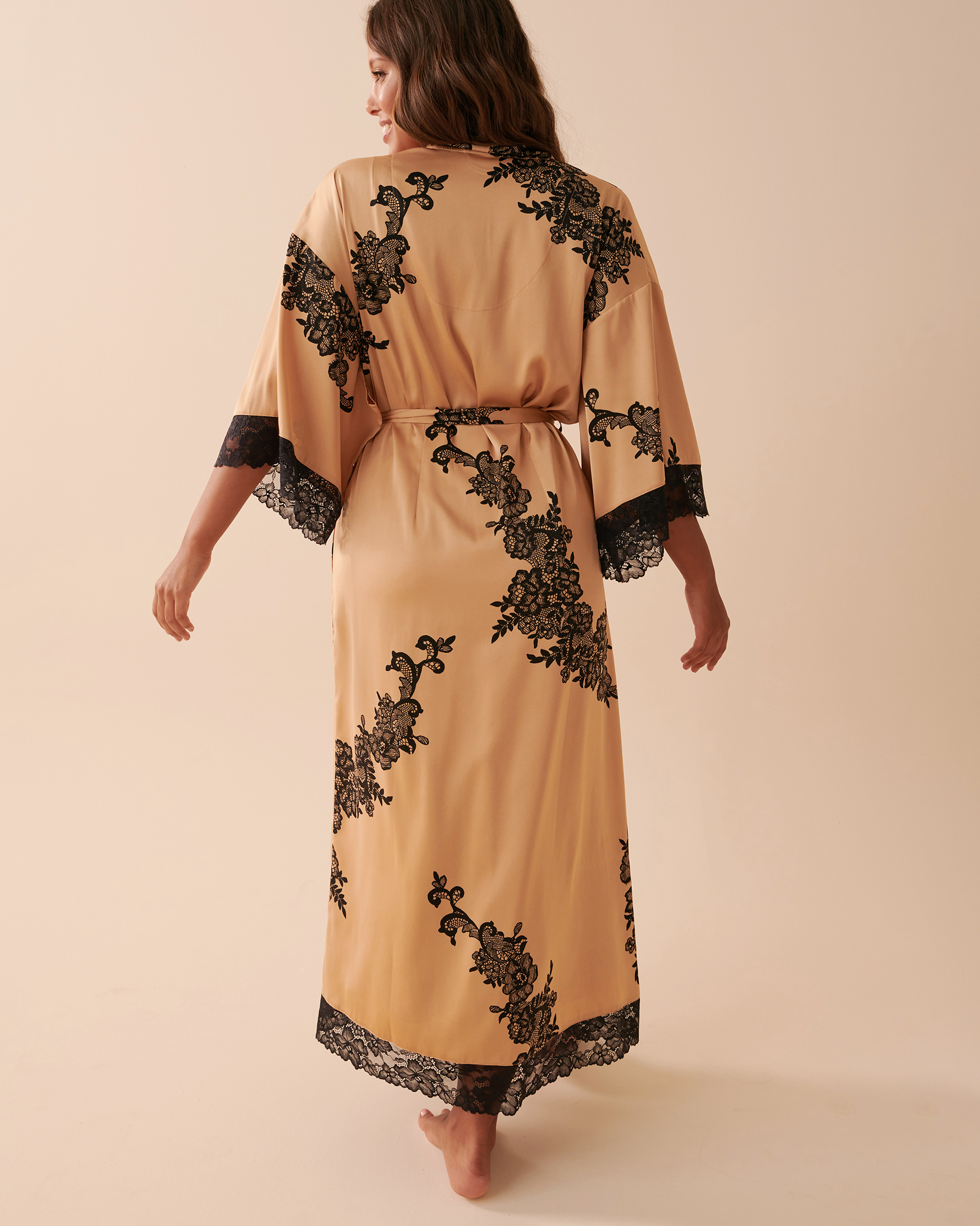 Confectionné dans un tissu infiniment soyeux et orné d'une dentelle délicate, d'une belle teinte et d'un motif floral enchanteur, ce kimono en satin vous promet un moment de détente élégant et ressourçant.