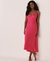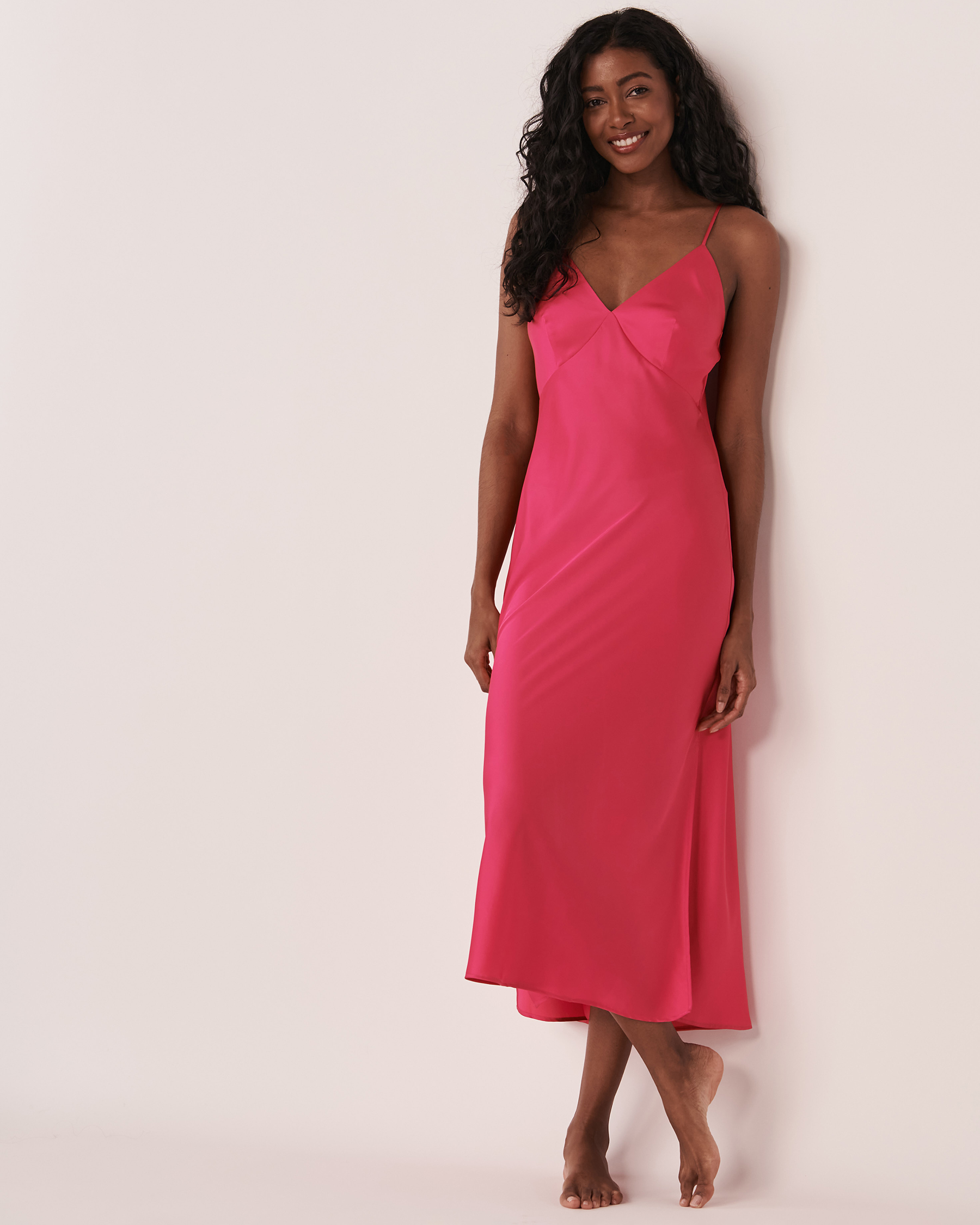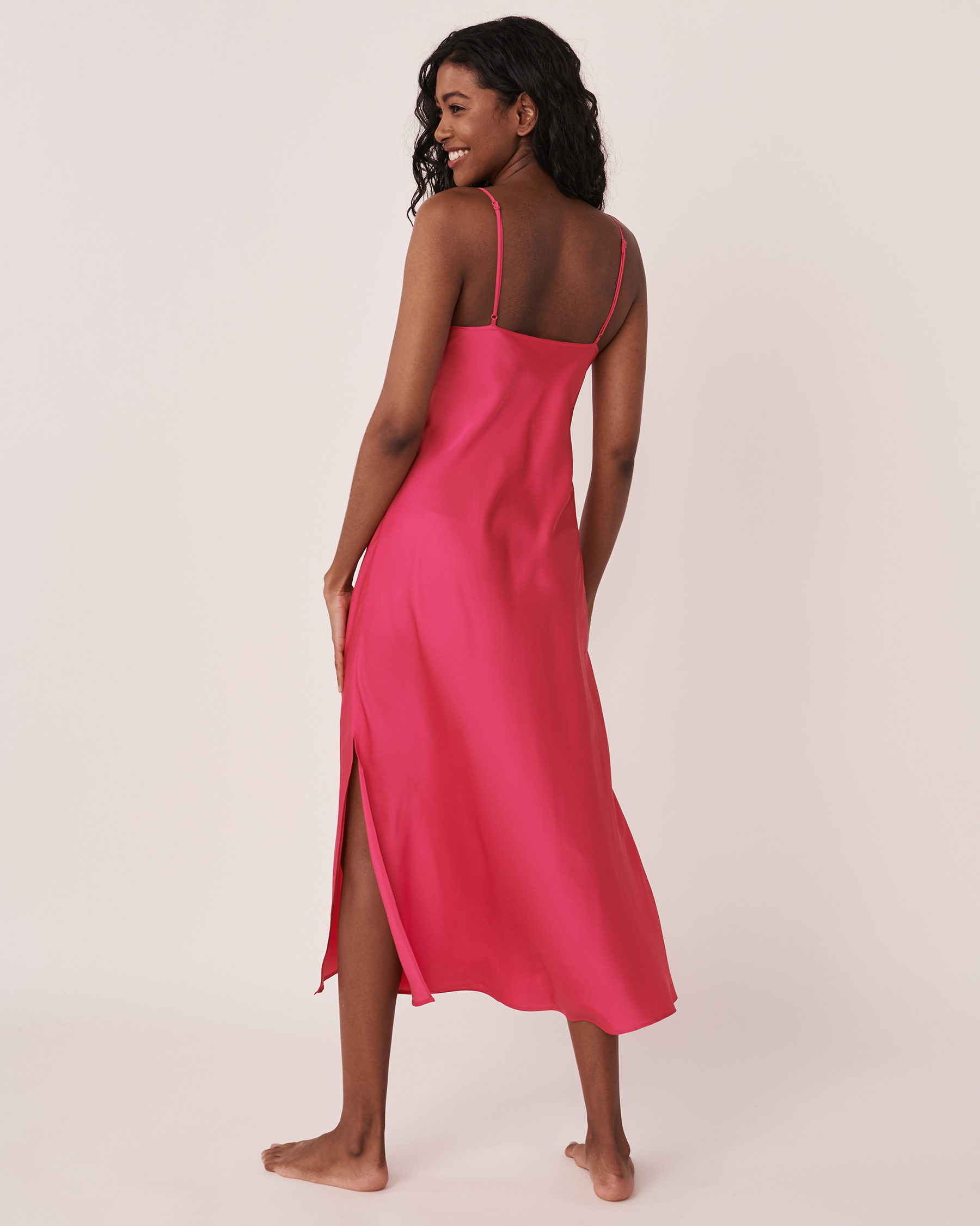 Fuchsia en folie! Nuisette en satin mi-longue avec bretelles minces ajustables.