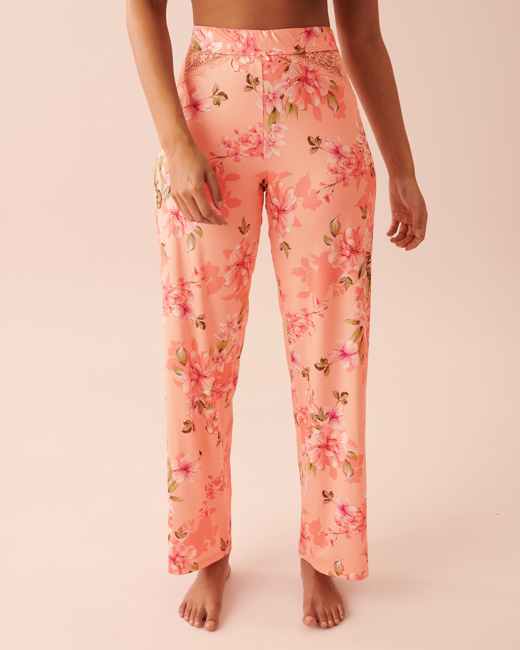 Laissez-vous séduire par le charme de notre pantalon à détails en dentelle dont la teinte corail vibrante se mêle à de luxueux motifs floraux.
