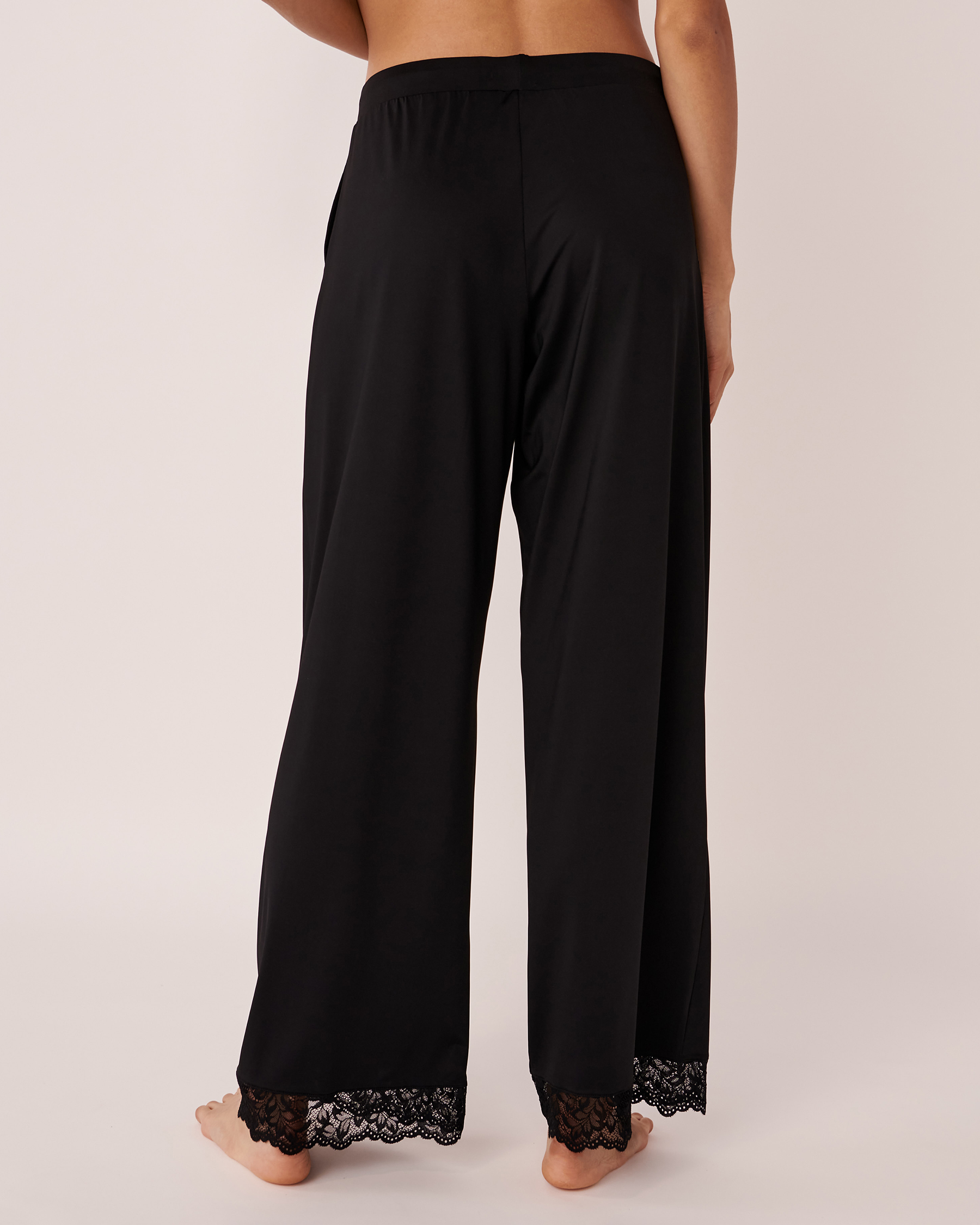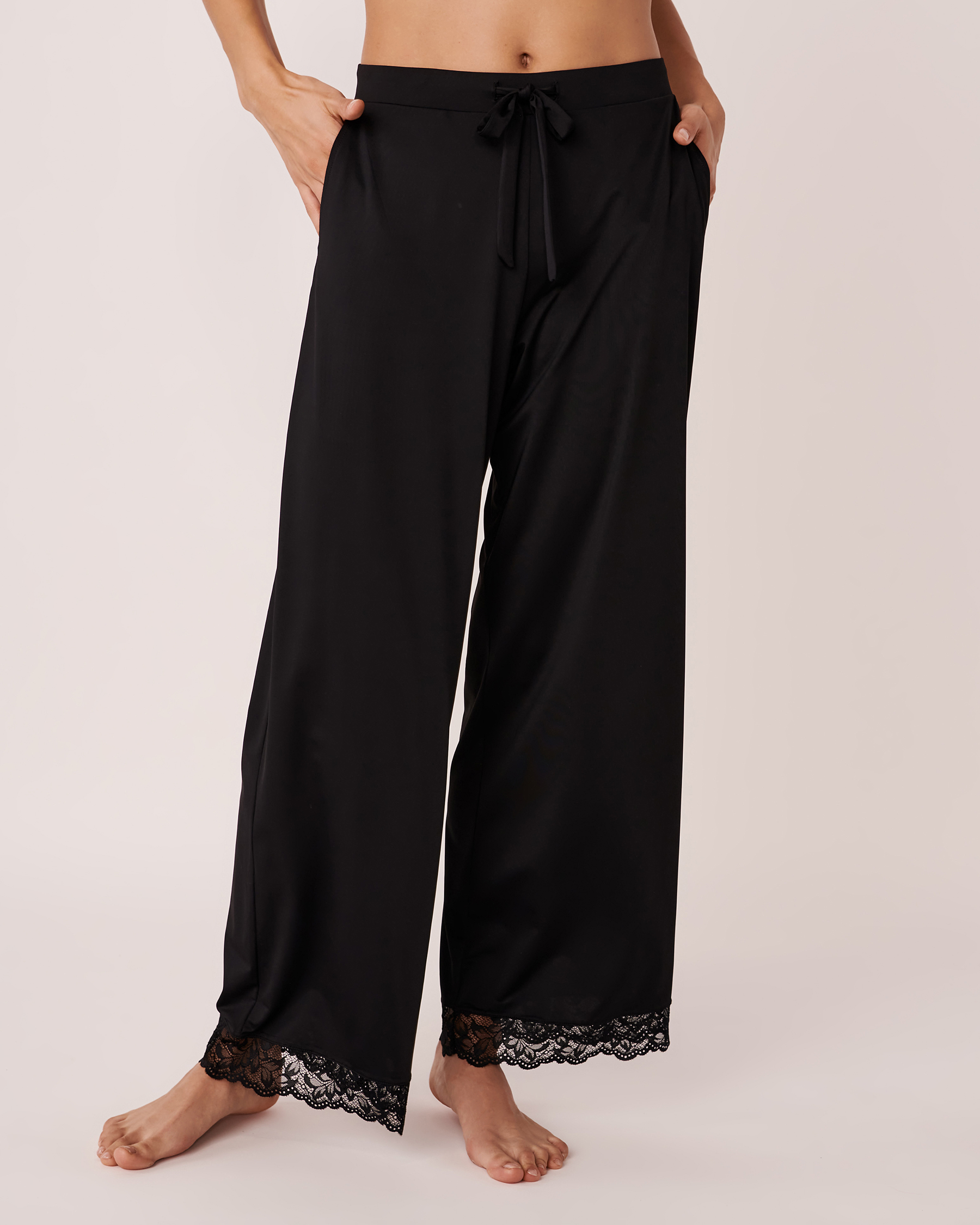 Bâtissez votre garde-robe avec cette collection d'essentiels! Pantalon noir à jambe large avec poches sur les côtés et bordure de dentelle.