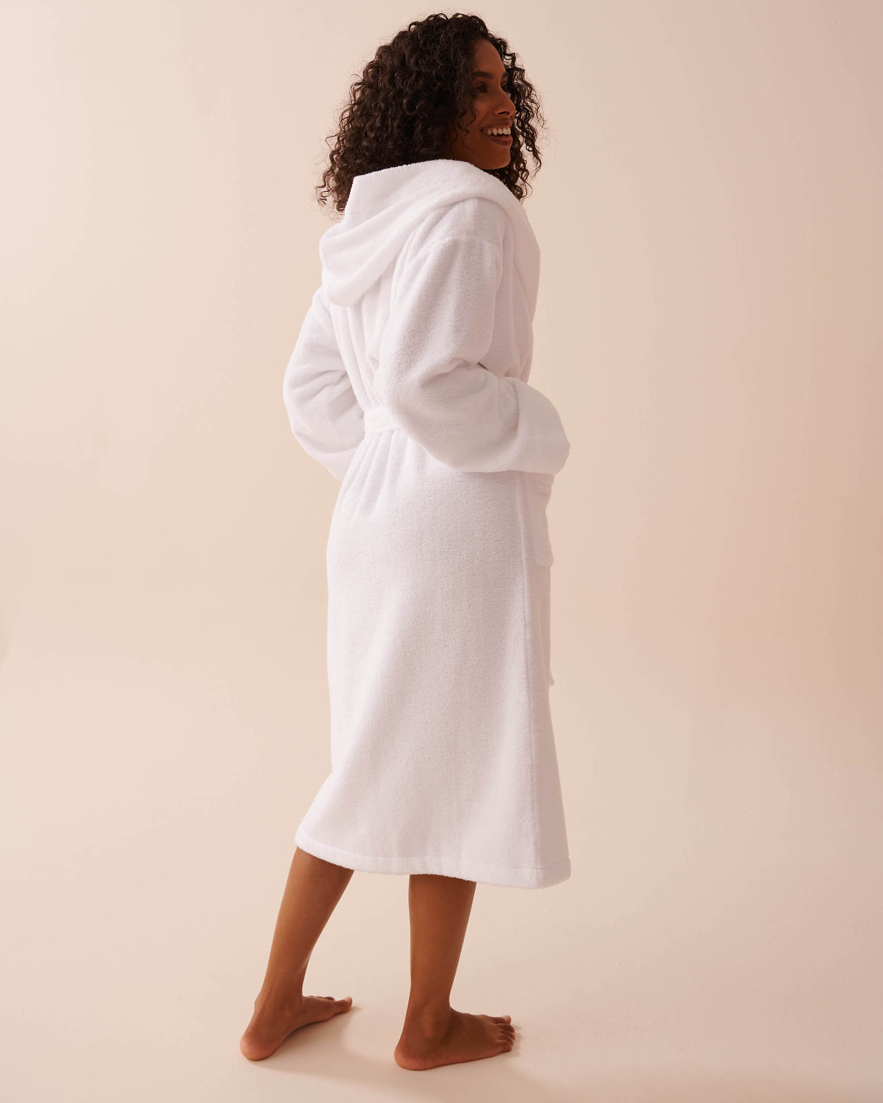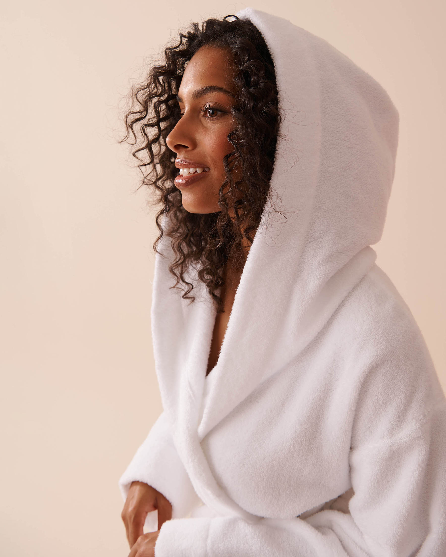 Un peignoir en ratine douce, doté d'une capuche généreuse pour un confort absolu. C'est comme si vous étiez au spa, prête à vous détendre et à vous ressourcer.