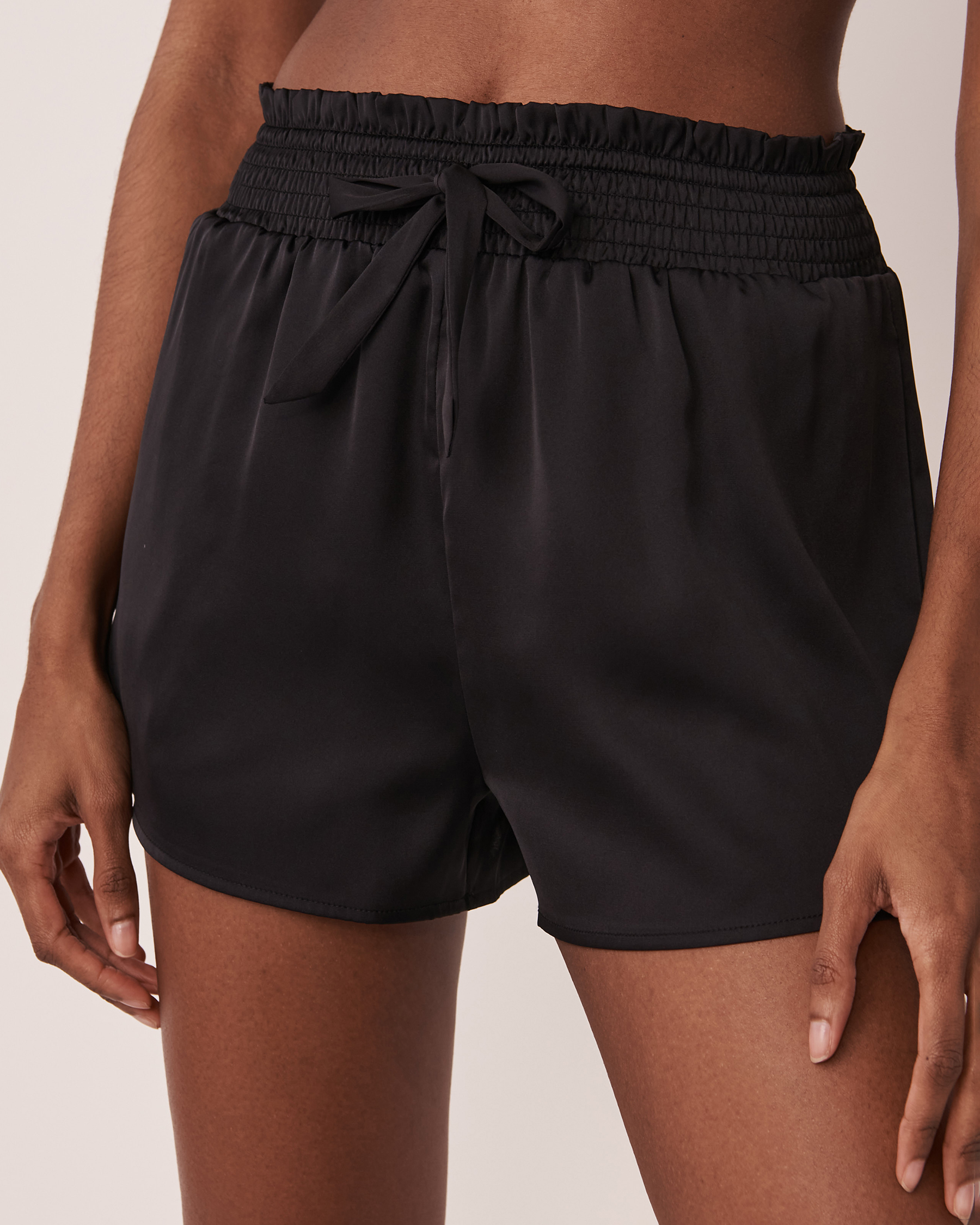 Un essentiel à avoir dans votre garde-robe! Short en satin noir avec large bande de taille élastique.