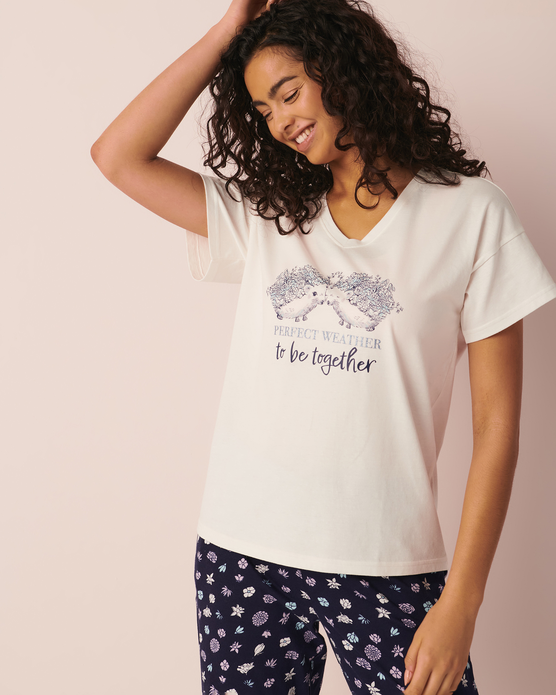 Hérissons en amour! T-shirt en coton à encolure en V avec imprimé brillant à l'avant.