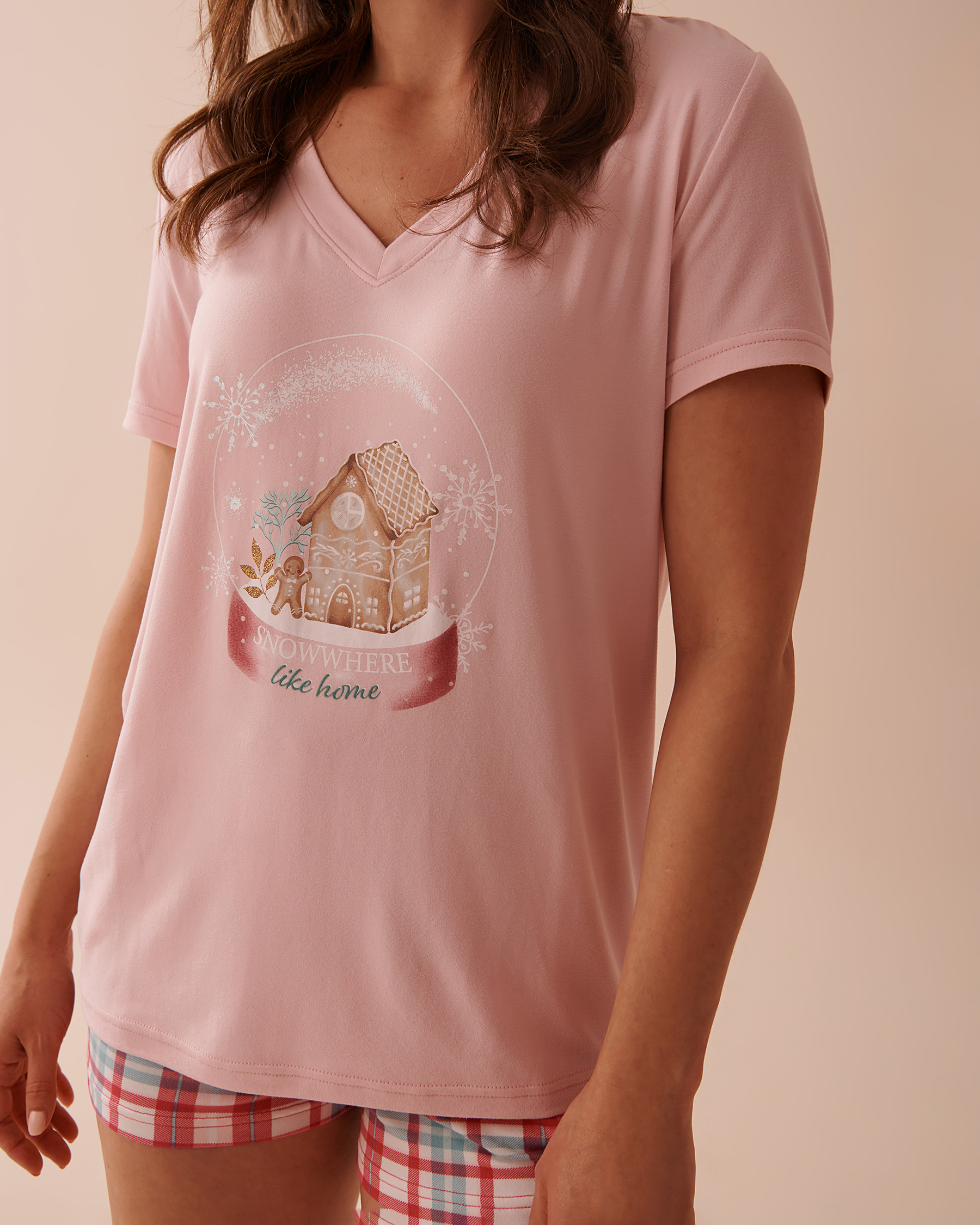 T-shirt col en V ultra doux à imprimé pain d'épices