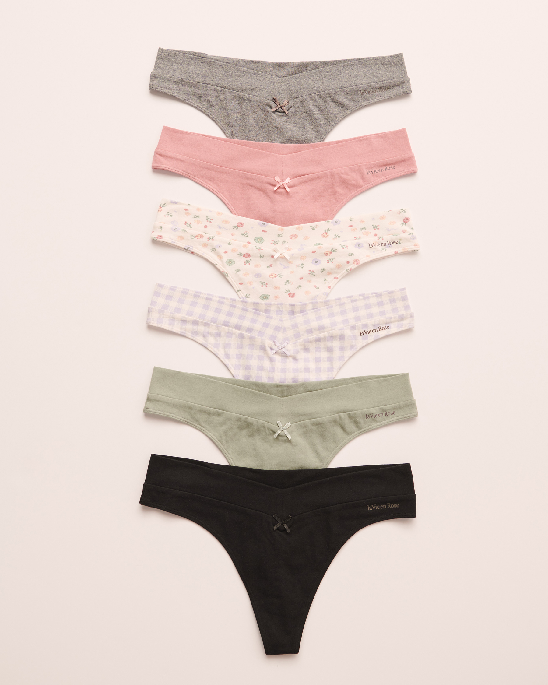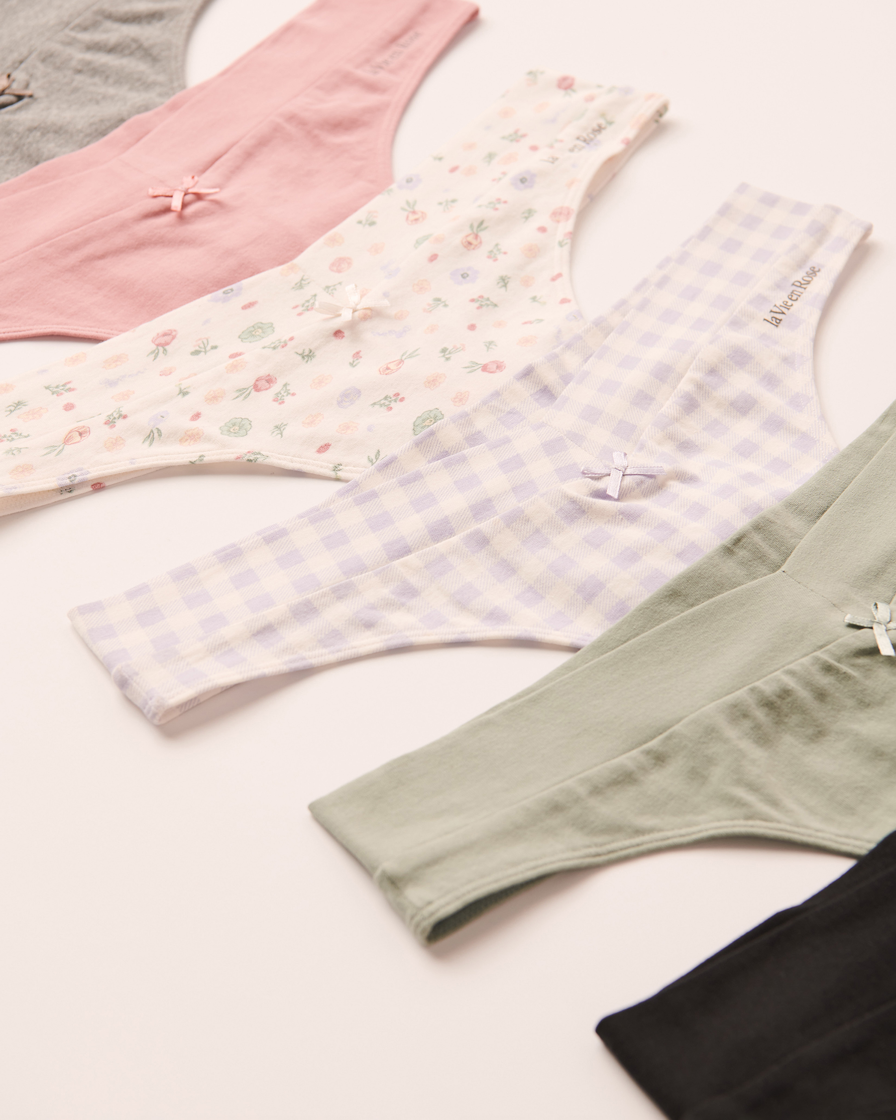 The colors and prints of the pack are: black, grey, pink, sage, vichy, floral