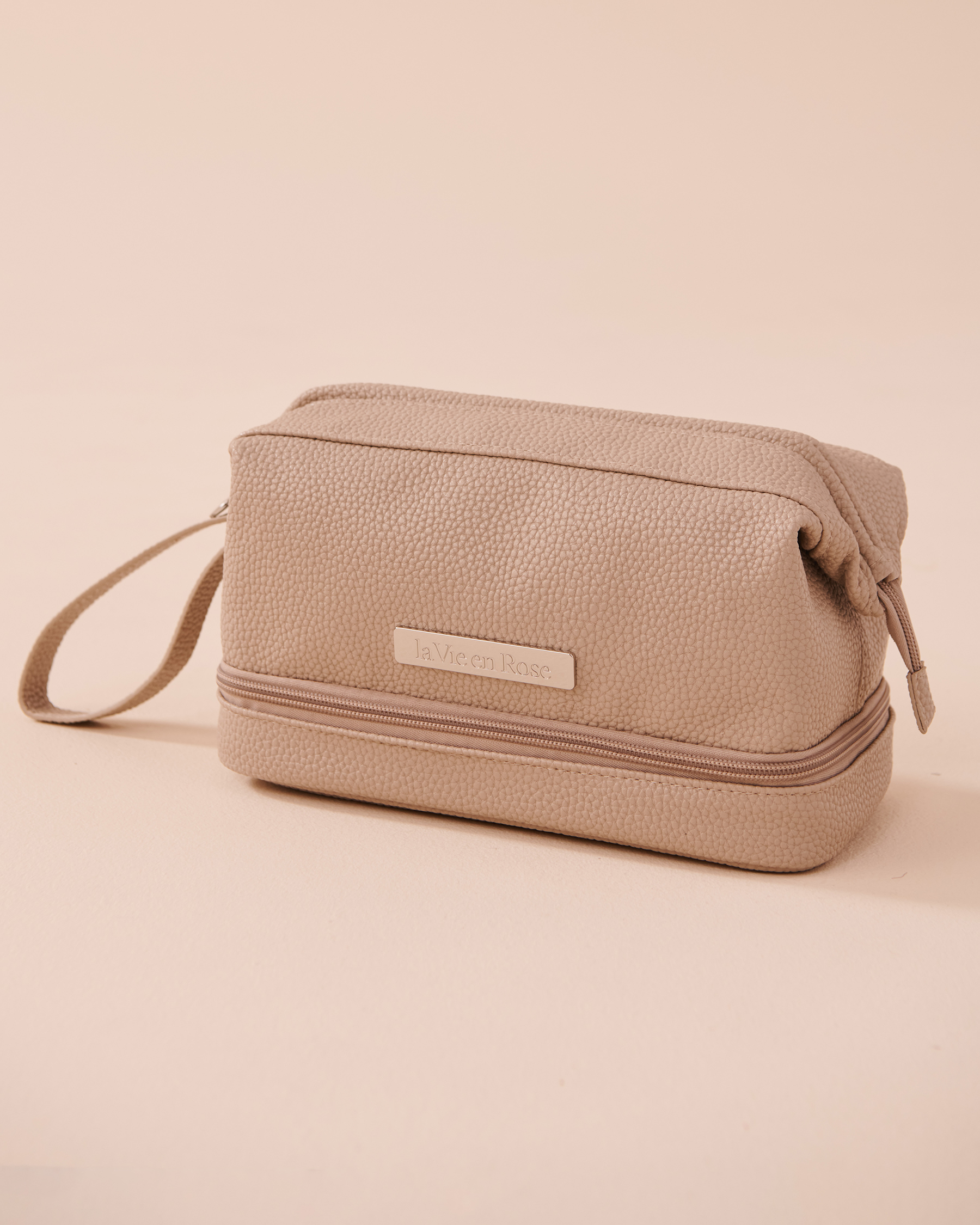 A minimalist cosmetic bag with clean lines and neutral colors, offering plenty of space and internal compartments to keep all your beauty essentials organized. For a limited time, only $9.95 with any purchase.