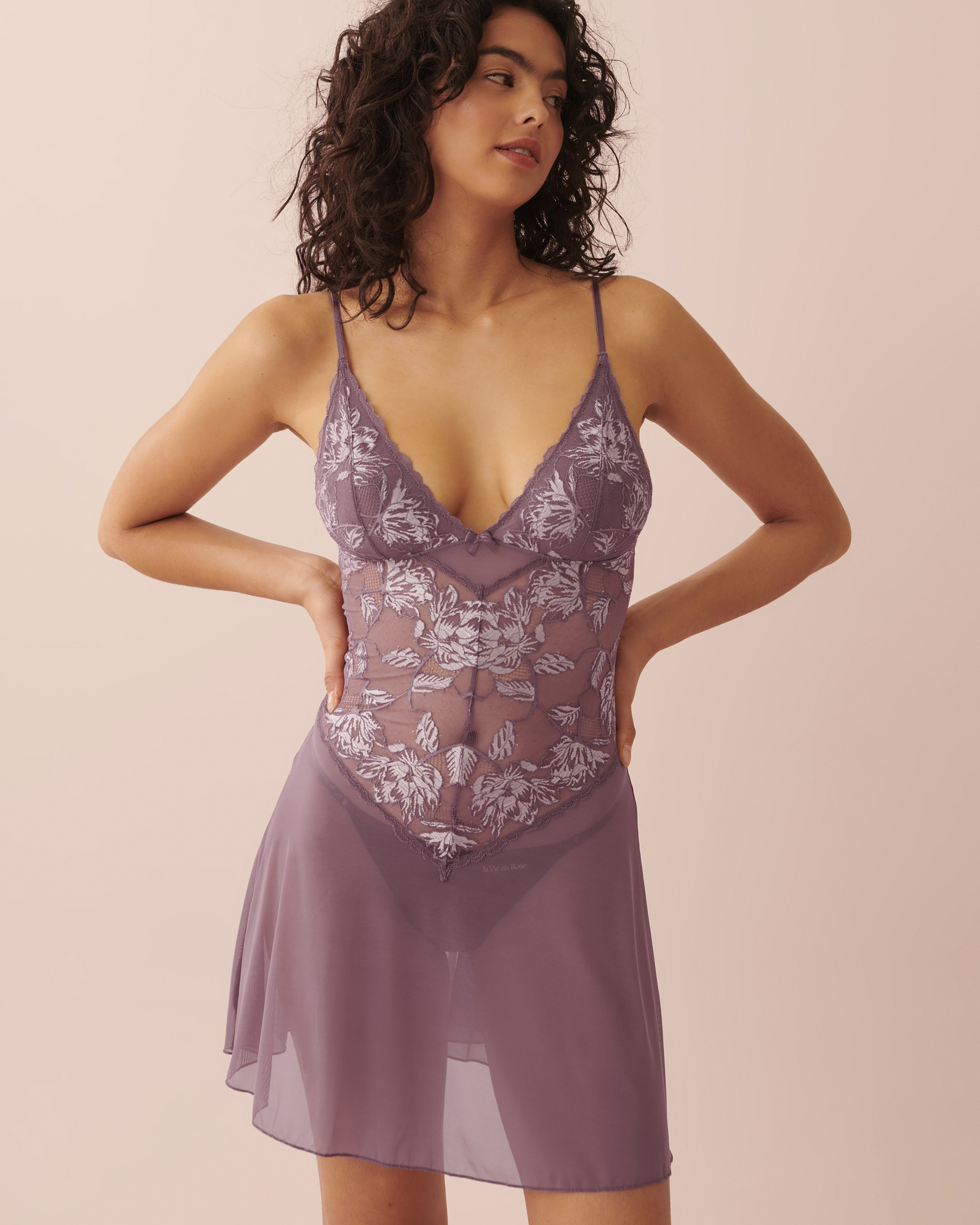 With its plunging style embellished with a delicate lace and mesh trim, this elegant nightie will sublimate your shape. Its beautiful transparency will make your movements even more fluid and graceful.