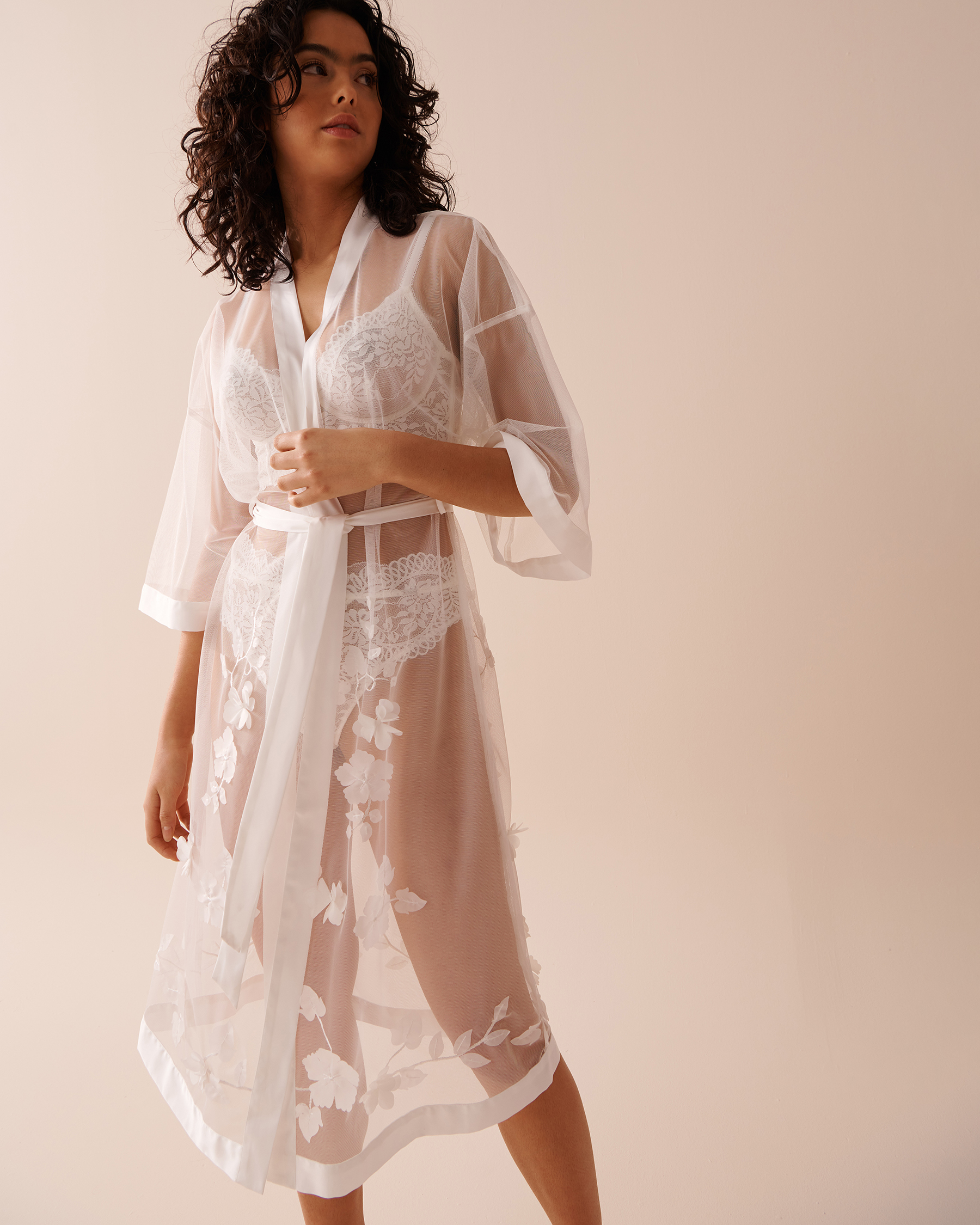 Add a layer of grace to your lingerie with our long sheer mesh kimono, and let your natural beauty shine through with its delicate floral poetry.