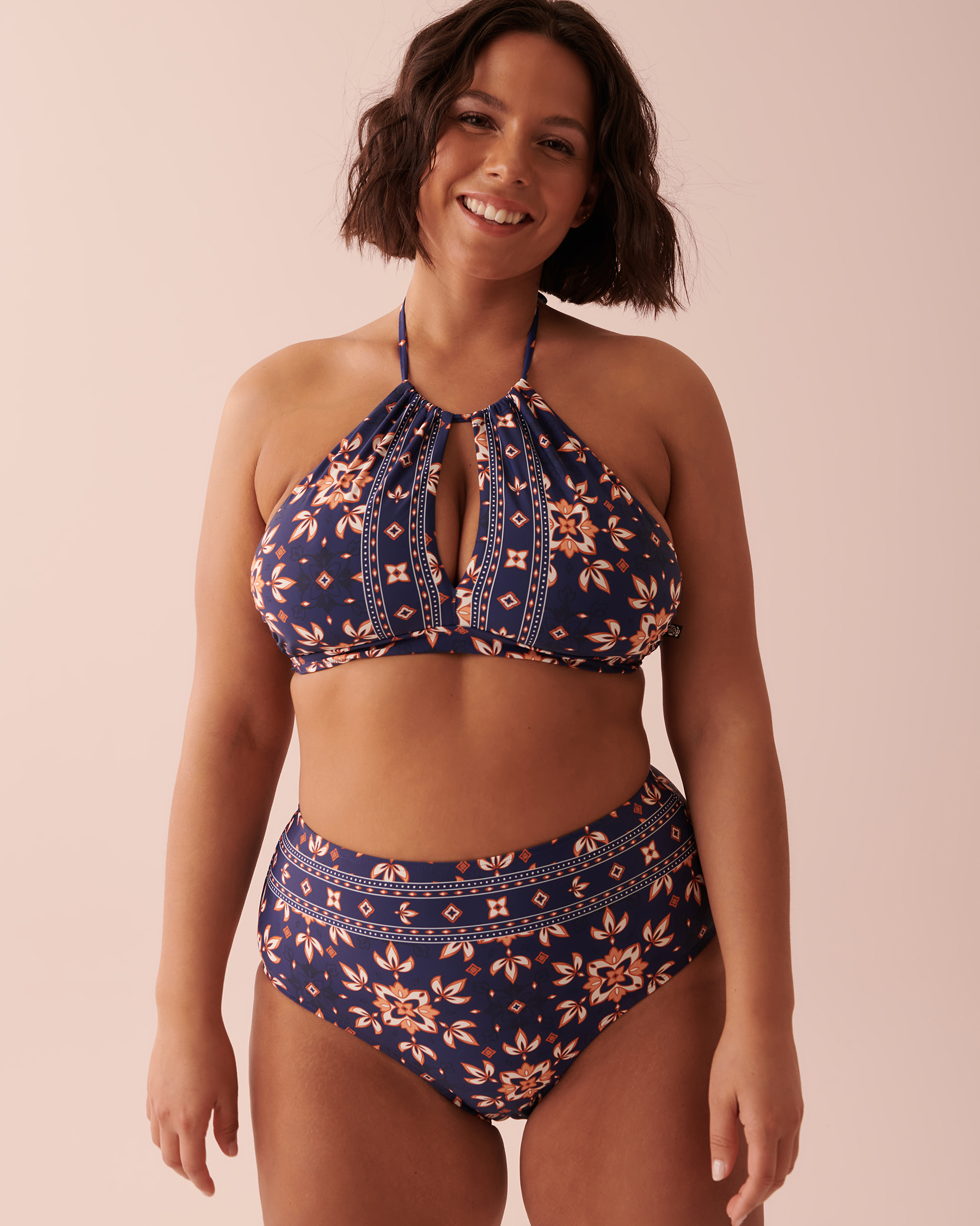 Channel colorful retro-chic vibes with this high-neck bikini top! Its captivating design accentuates your natural curves and adds a touch of elegance to your beach look.