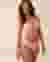 Mannequin seen from behind wearing a brown bikini with pink flowers
