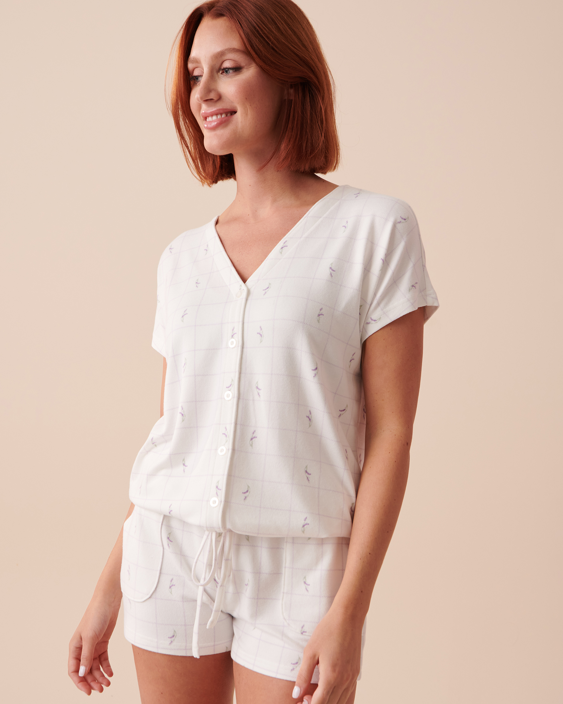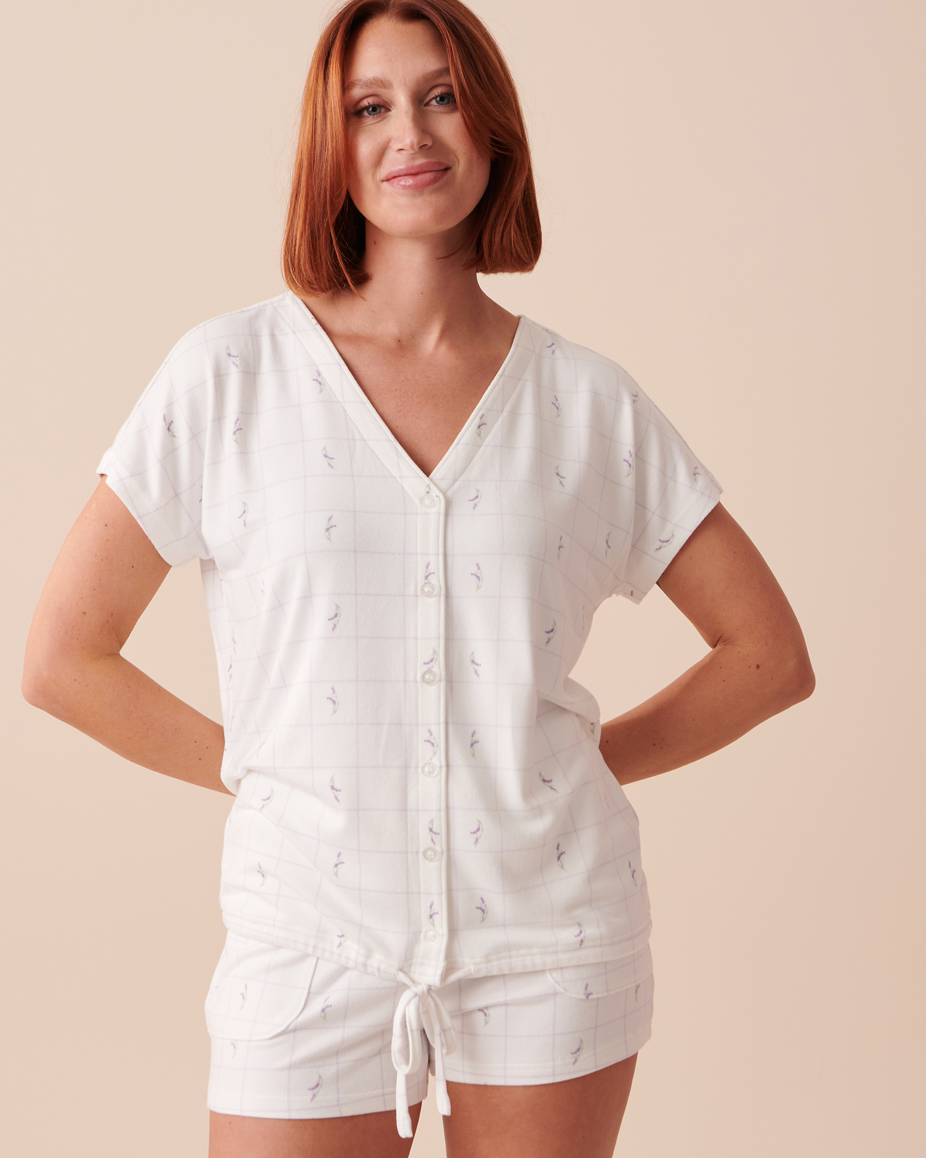 Add a delicate touch of charm to your pajamas with this cozy button-down shirt ensuring nights of softness and tranquility.