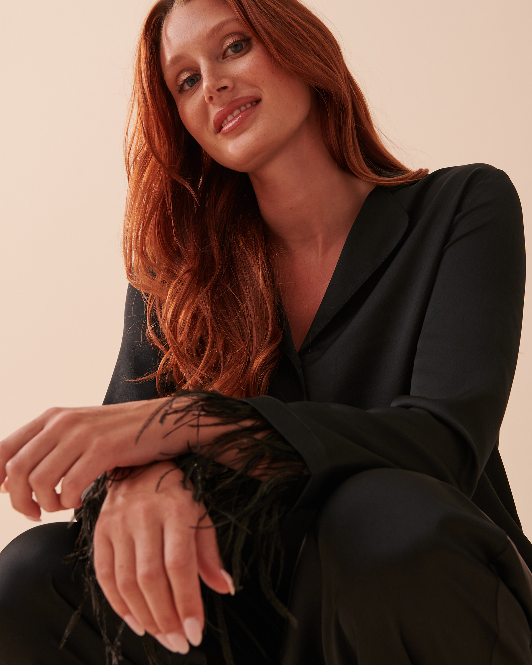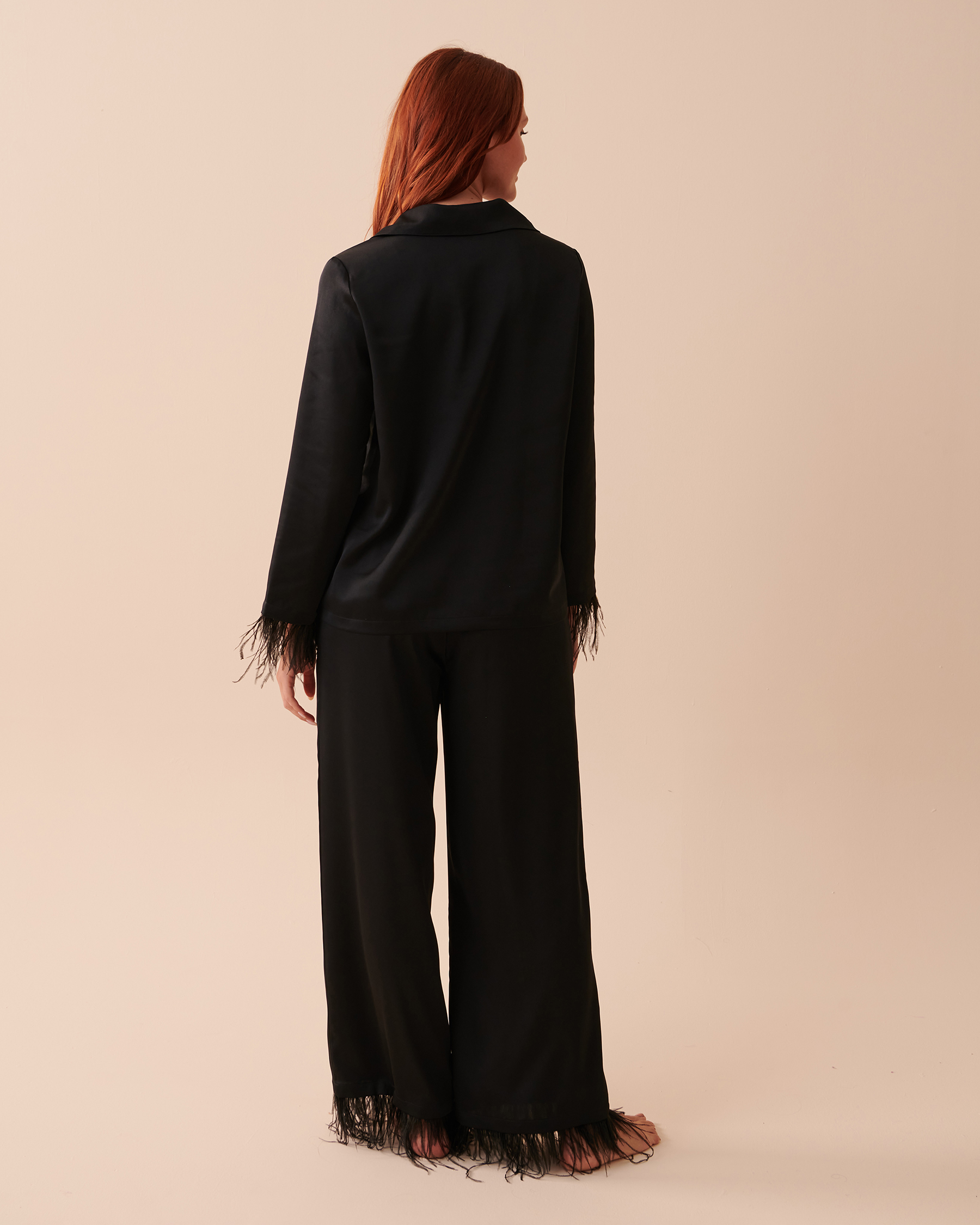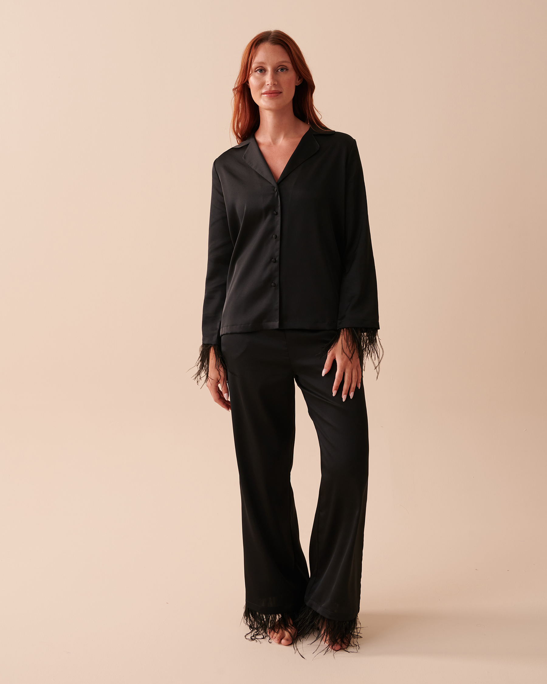 Add a touch of feathered elegance to your lounge collection with our satin PJ set. This charming ensemble features a chic button-down shirt and pants to embrace ultimate comfort in style!