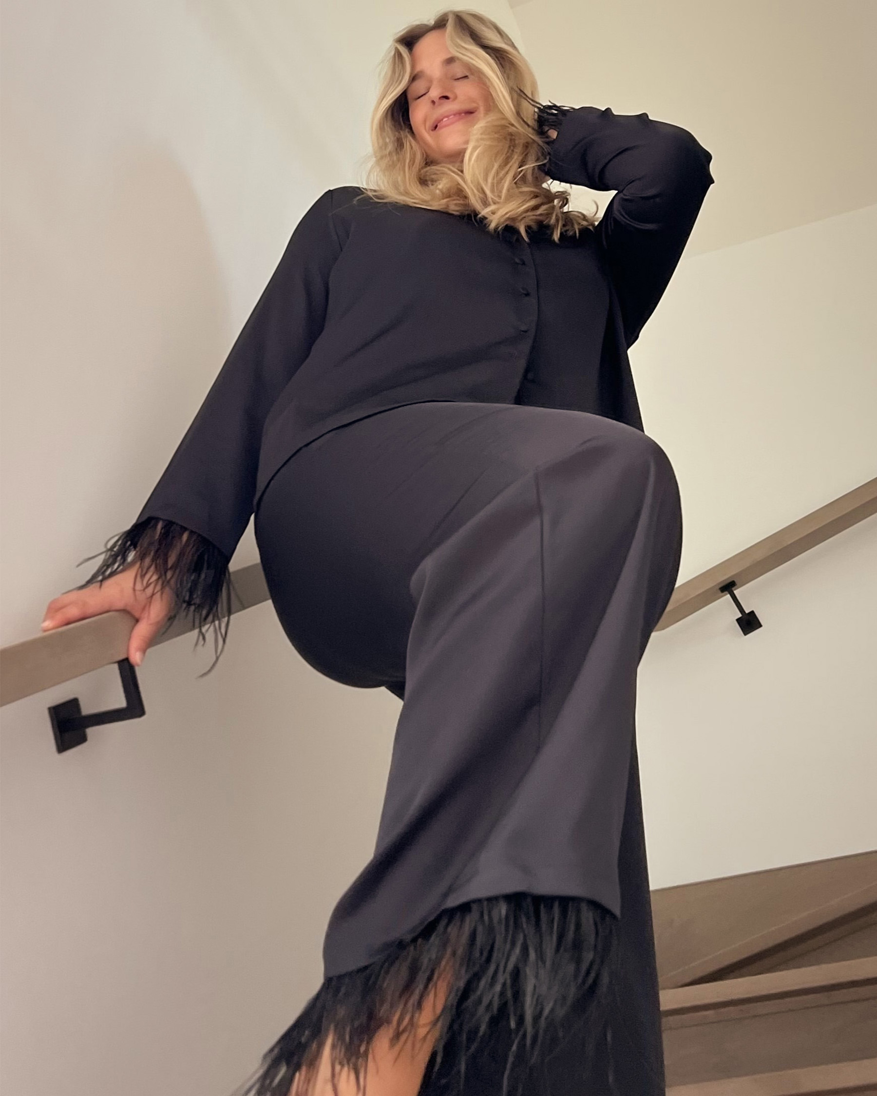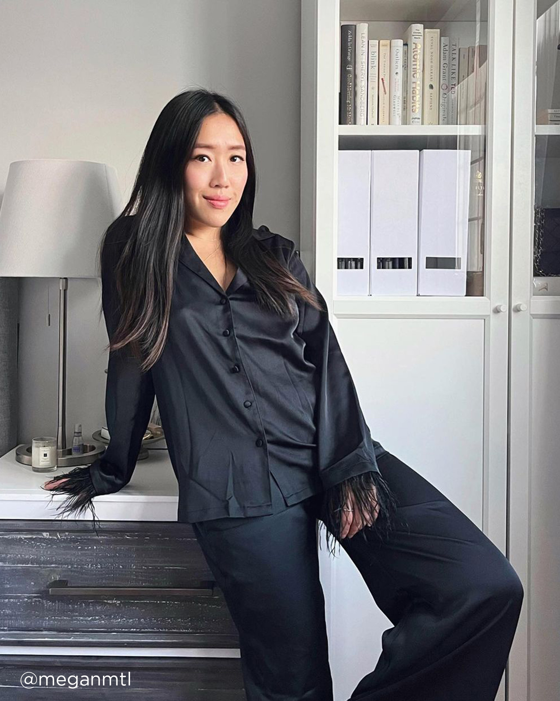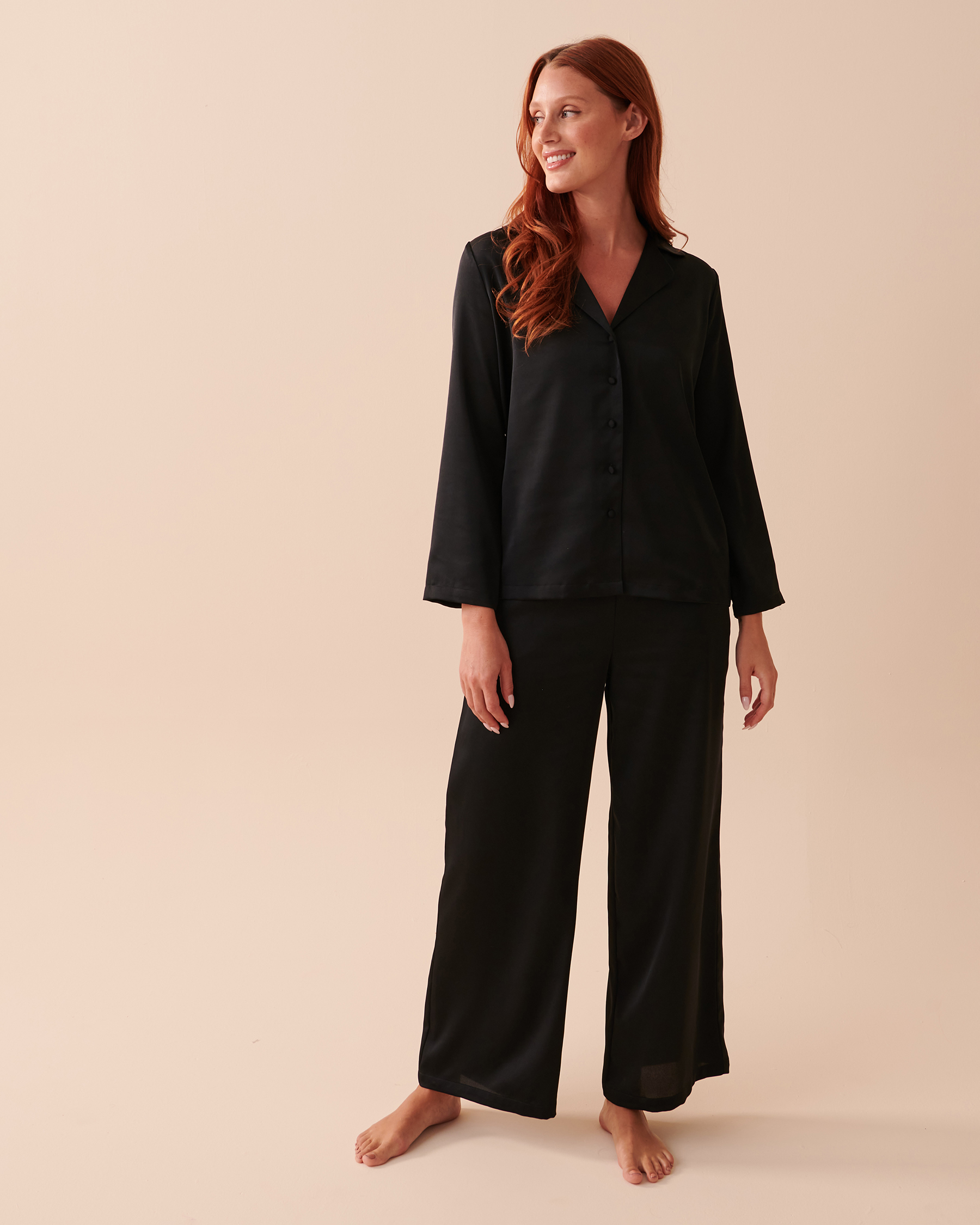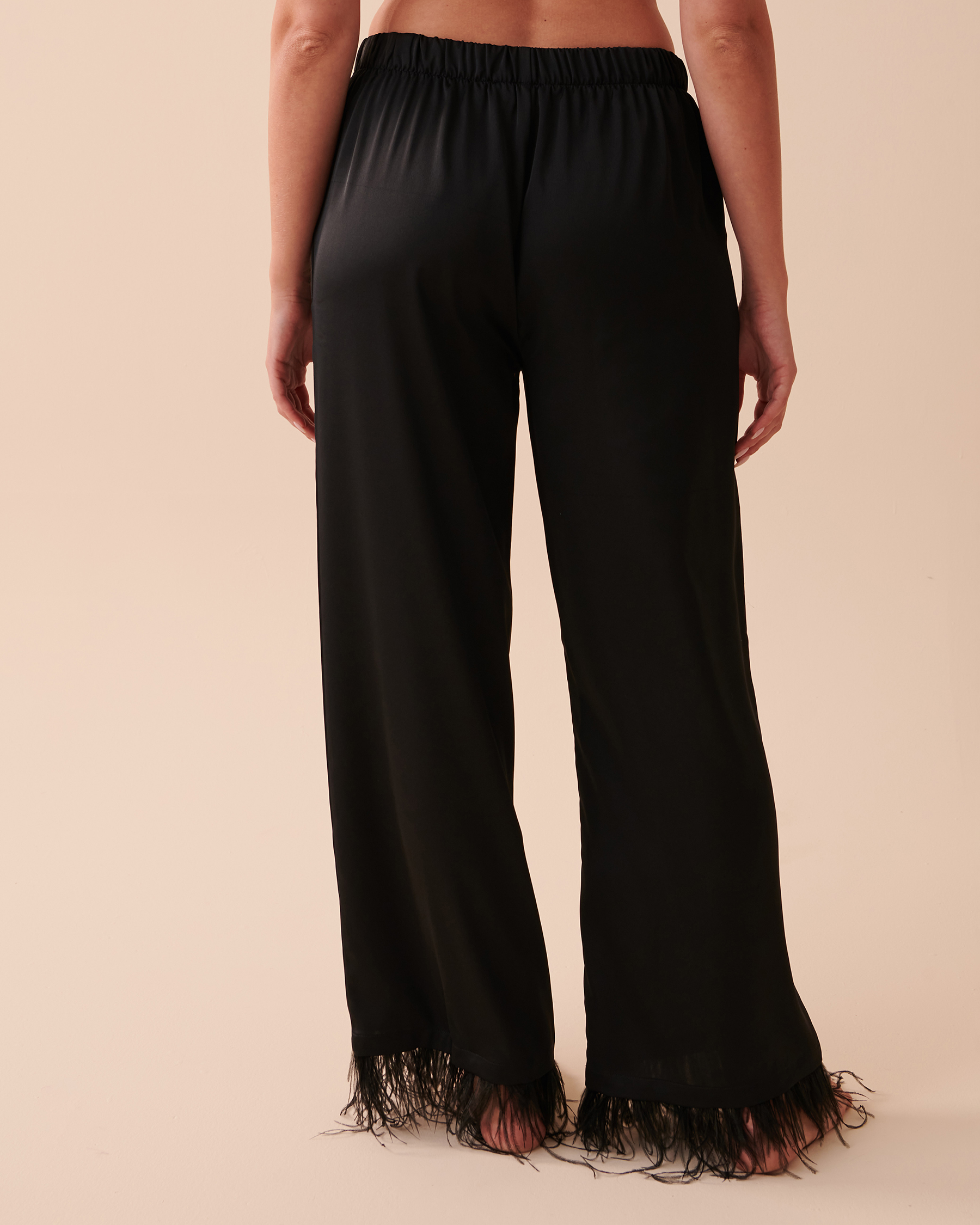 Add a touch of feathered elegance to your lounge collection with our satin PJ set. This charming ensemble features a chic button-down shirt and pants to embrace ultimate comfort in style!