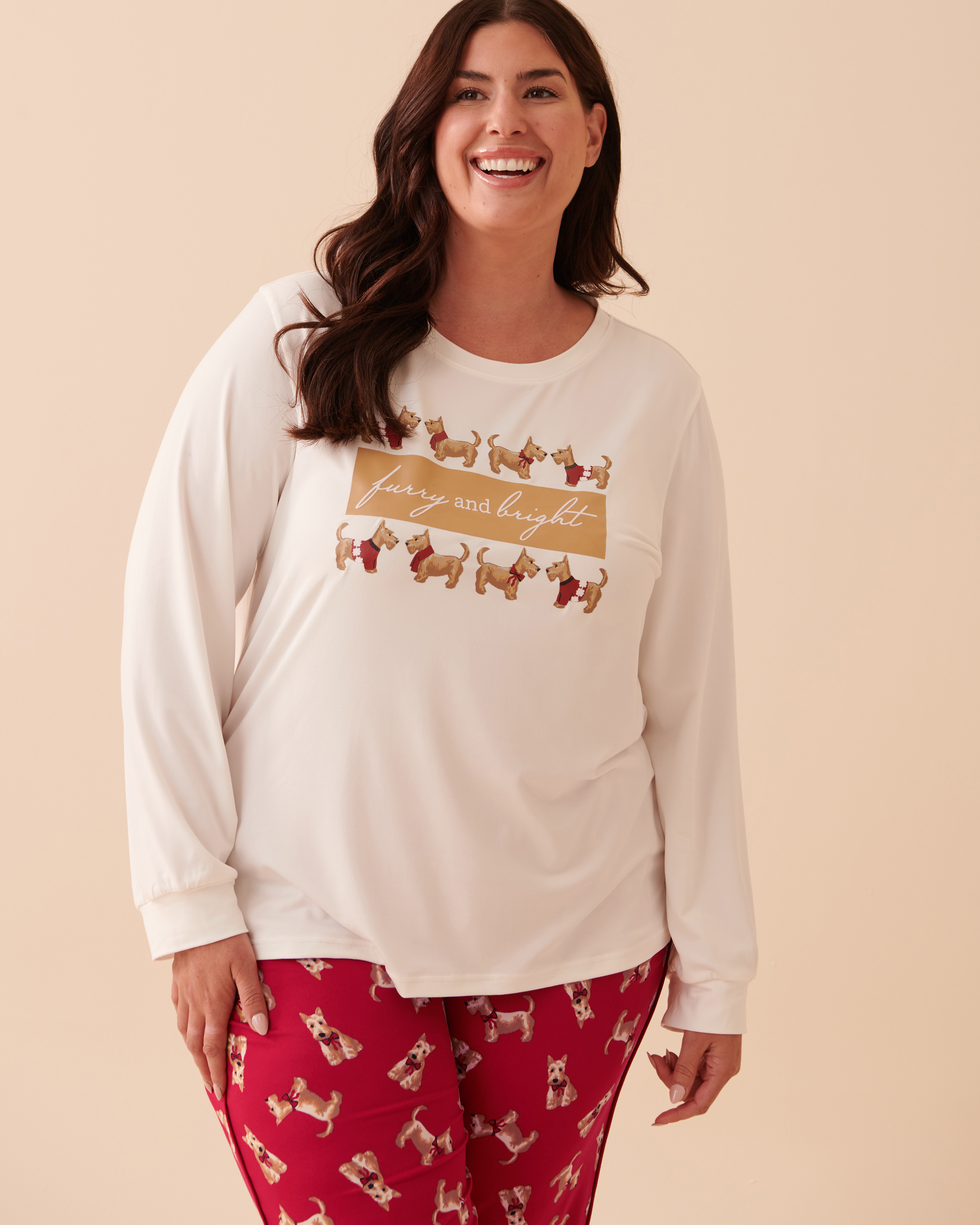 Add an extra wag of joy to your holiday season with this Scottie print super soft long-sleeve shirt and experience cloud-like comfort! Just like our furry friends, let this shirt become a cherished part of your festive moments.