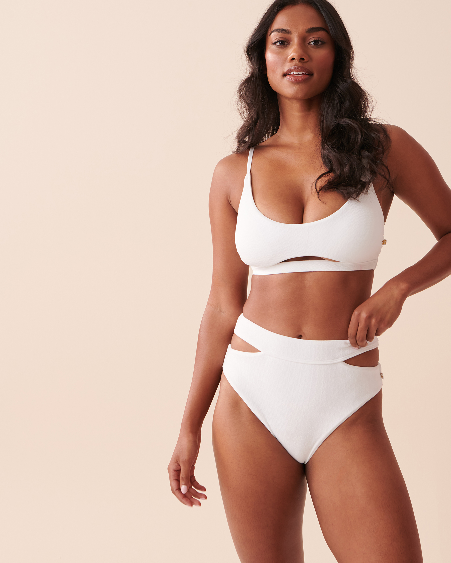 The flattering, curve-hugging high-waist design takes on an edgy twist in this textured bikini bottom with cutout details.
